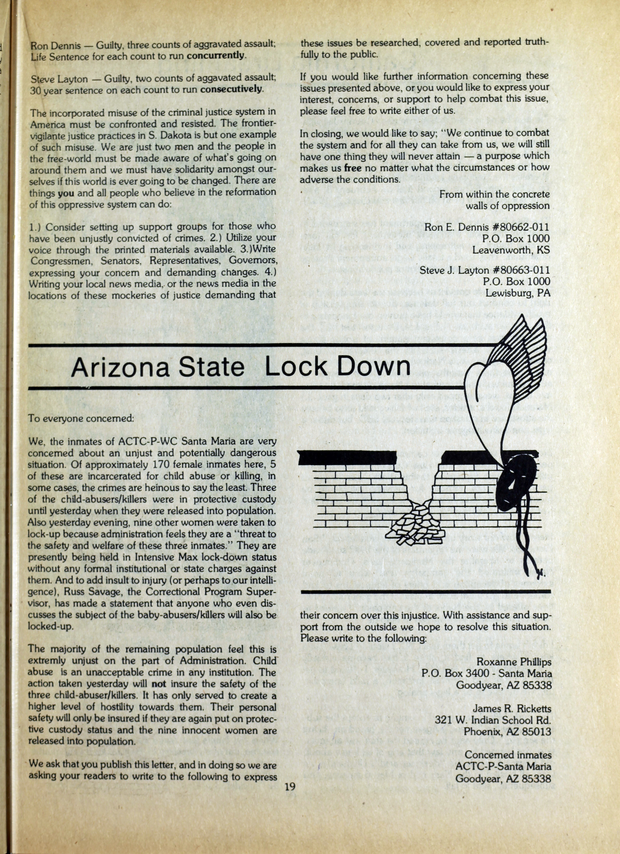 An anarchist publication from Toronto made to support prisoners in various penal institutions. It began in 1980 and featured articles, letters, art, poetry etc. by prisoners and ex-prisoners. By Spring 1997 it had incorporated another journal called the Prison News Service and began to focus more on justice-related issues in Canada, namely: prisons, local jails, refugee detention centres, and First Nations self-determination. In this issue: "Introduction"; "Free the Vancouver Five" [poster title]; "Vancouver Five for life"; "Against the corporate state"; "Southern Buffalo spirit"; "Dakota revenge"; "Arizona State lock down"; "California dreaming"; "Cesspool plunge"; "Report from the Puerto Rican Movement"; "Soldiers of discontent"; "Anarchy can't fight alone"; "Prison, poverty, and power"; "Turtle Island under a cloud"; "Money appeal"; "Survival network"; "Ossining riot"; "Stepping on mocassin"; "Note from Walla Walla"; "Rape is still rape"; "Spiritual feasting"