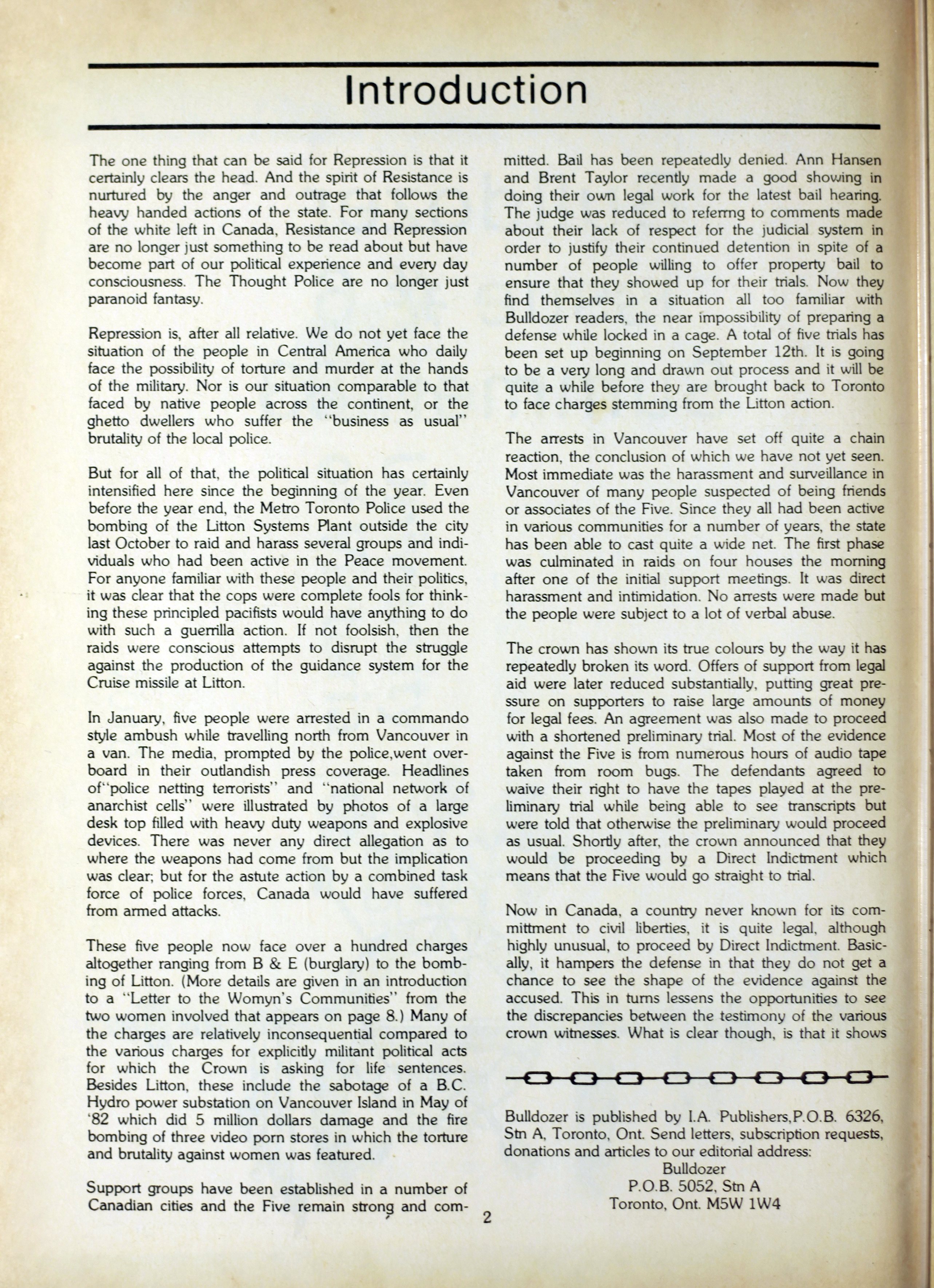 An anarchist publication from Toronto made to support prisoners in various penal institutions. It began in 1980 and featured articles, letters, art, poetry etc. by prisoners and ex-prisoners. By Spring 1997 it had incorporated another journal called the Prison News Service and began to focus more on justice-related issues in Canada, namely: prisons, local jails, refugee detention centres, and First Nations self-determination. In this issue: "Introduction"; "Free the Vancouver Five" [poster title]; "Vancouver Five for life"; "Against the corporate state"; "Southern Buffalo spirit"; "Dakota revenge"; "Arizona State lock down"; "California dreaming"; "Cesspool plunge"; "Report from the Puerto Rican Movement"; "Soldiers of discontent"; "Anarchy can't fight alone"; "Prison, poverty, and power"; "Turtle Island under a cloud"; "Money appeal"; "Survival network"; "Ossining riot"; "Stepping on mocassin"; "Note from Walla Walla"; "Rape is still rape"; "Spiritual feasting"