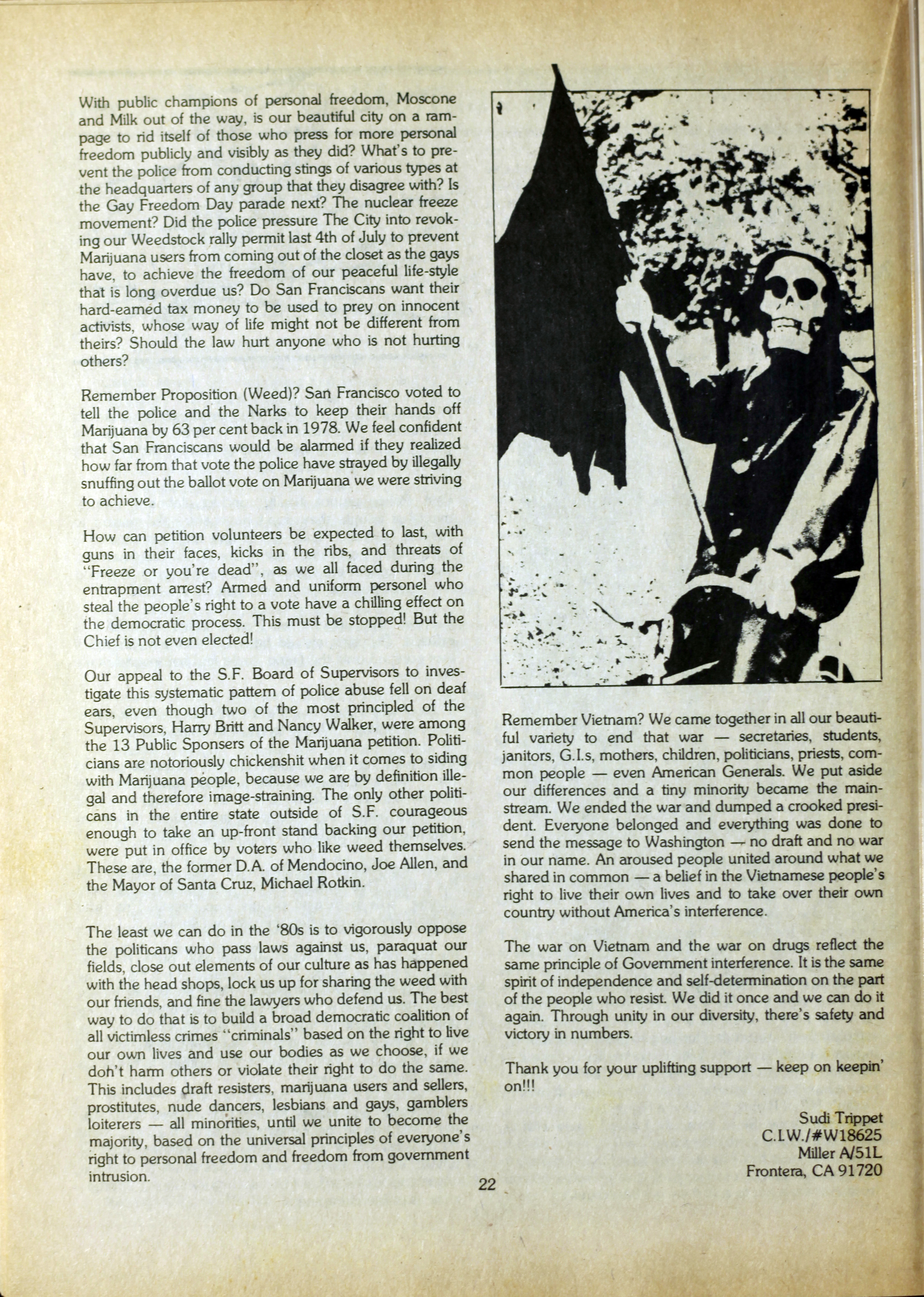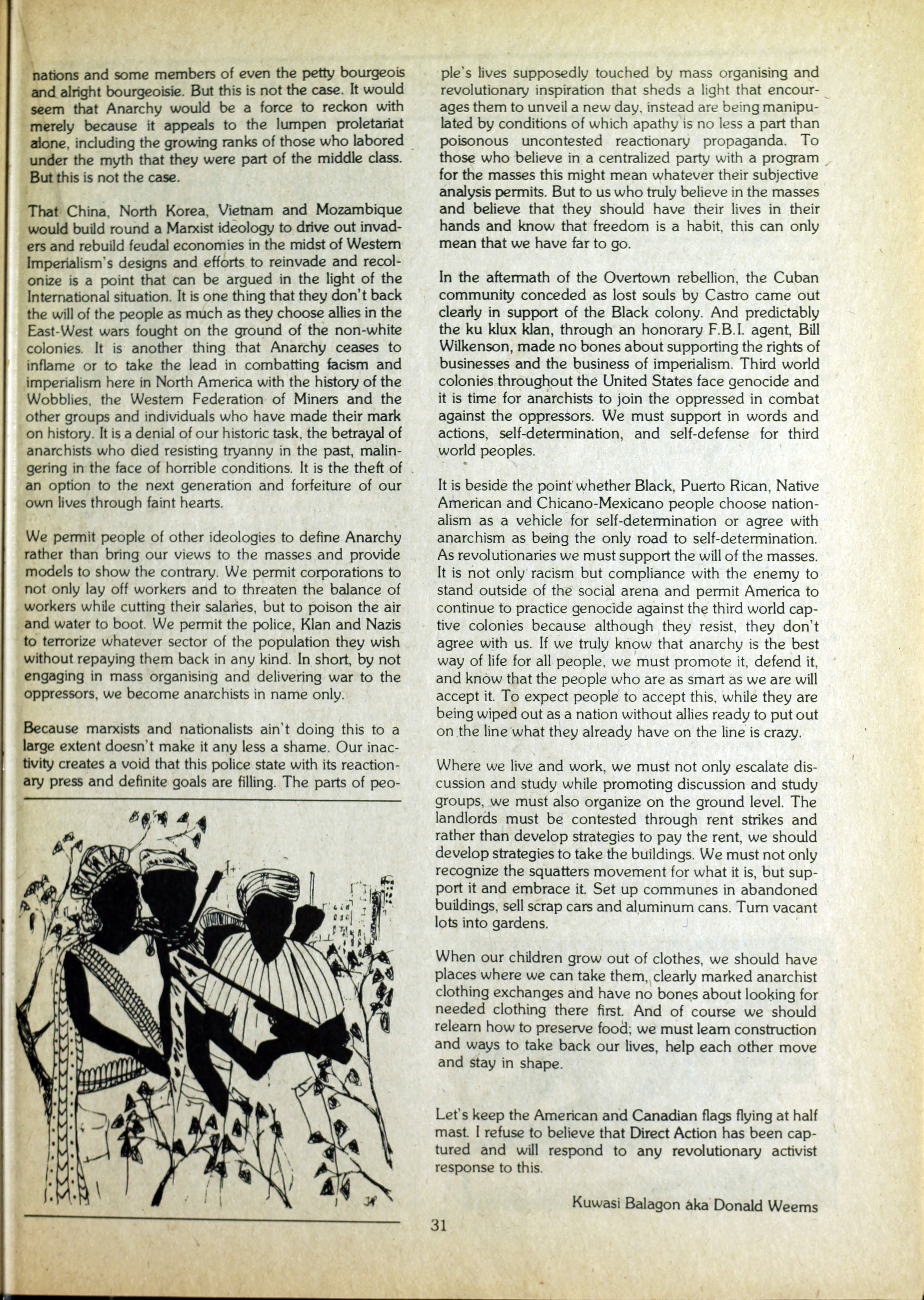An anarchist publication from Toronto made to support prisoners in various penal institutions. It began in 1980 and featured articles, letters, art, poetry etc. by prisoners and ex-prisoners. By Spring 1997 it had incorporated another journal called the Prison News Service and began to focus more on justice-related issues in Canada, namely: prisons, local jails, refugee detention centres, and First Nations self-determination. In this issue: "Introduction"; "Free the Vancouver Five" [poster title]; "Vancouver Five for life"; "Against the corporate state"; "Southern Buffalo spirit"; "Dakota revenge"; "Arizona State lock down"; "California dreaming"; "Cesspool plunge"; "Report from the Puerto Rican Movement"; "Soldiers of discontent"; "Anarchy can't fight alone"; "Prison, poverty, and power"; "Turtle Island under a cloud"; "Money appeal"; "Survival network"; "Ossining riot"; "Stepping on mocassin"; "Note from Walla Walla"; "Rape is still rape"; "Spiritual feasting"