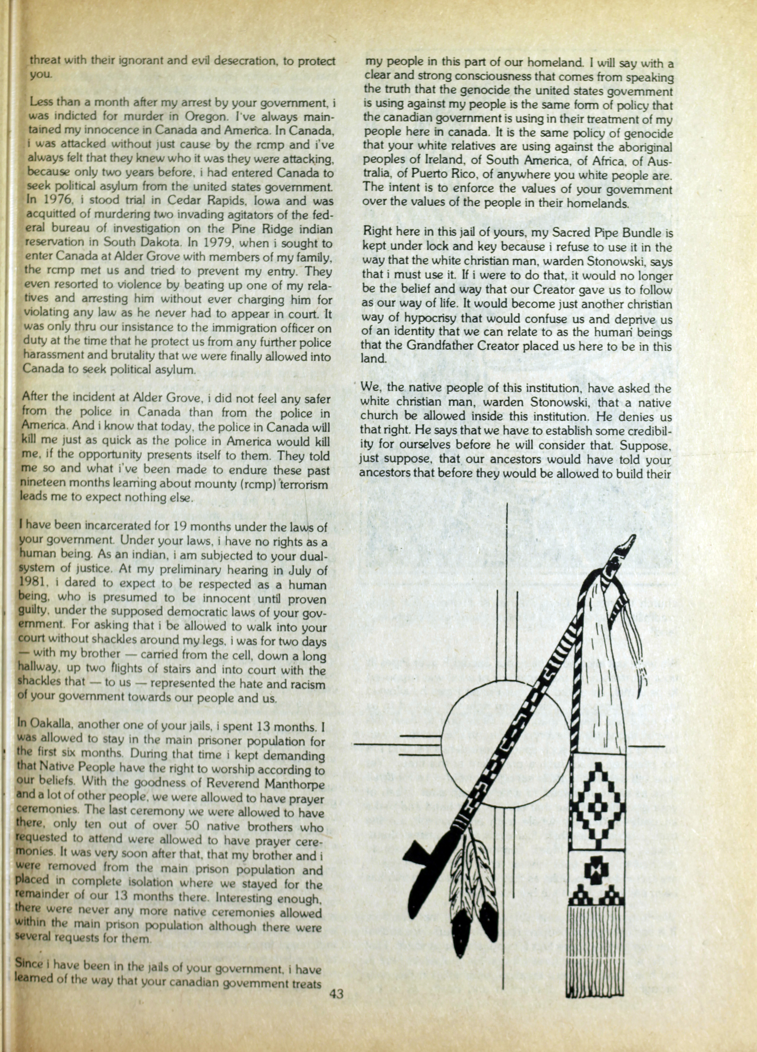 An anarchist publication from Toronto made to support prisoners in various penal institutions. It began in 1980 and featured articles, letters, art, poetry etc. by prisoners and ex-prisoners. By Spring 1997 it had incorporated another journal called the Prison News Service and began to focus more on justice-related issues in Canada, namely: prisons, local jails, refugee detention centres, and First Nations self-determination. In this issue: "Introduction"; "Free the Vancouver Five" [poster title]; "Vancouver Five for life"; "Against the corporate state"; "Southern Buffalo spirit"; "Dakota revenge"; "Arizona State lock down"; "California dreaming"; "Cesspool plunge"; "Report from the Puerto Rican Movement"; "Soldiers of discontent"; "Anarchy can't fight alone"; "Prison, poverty, and power"; "Turtle Island under a cloud"; "Money appeal"; "Survival network"; "Ossining riot"; "Stepping on mocassin"; "Note from Walla Walla"; "Rape is still rape"; "Spiritual feasting"