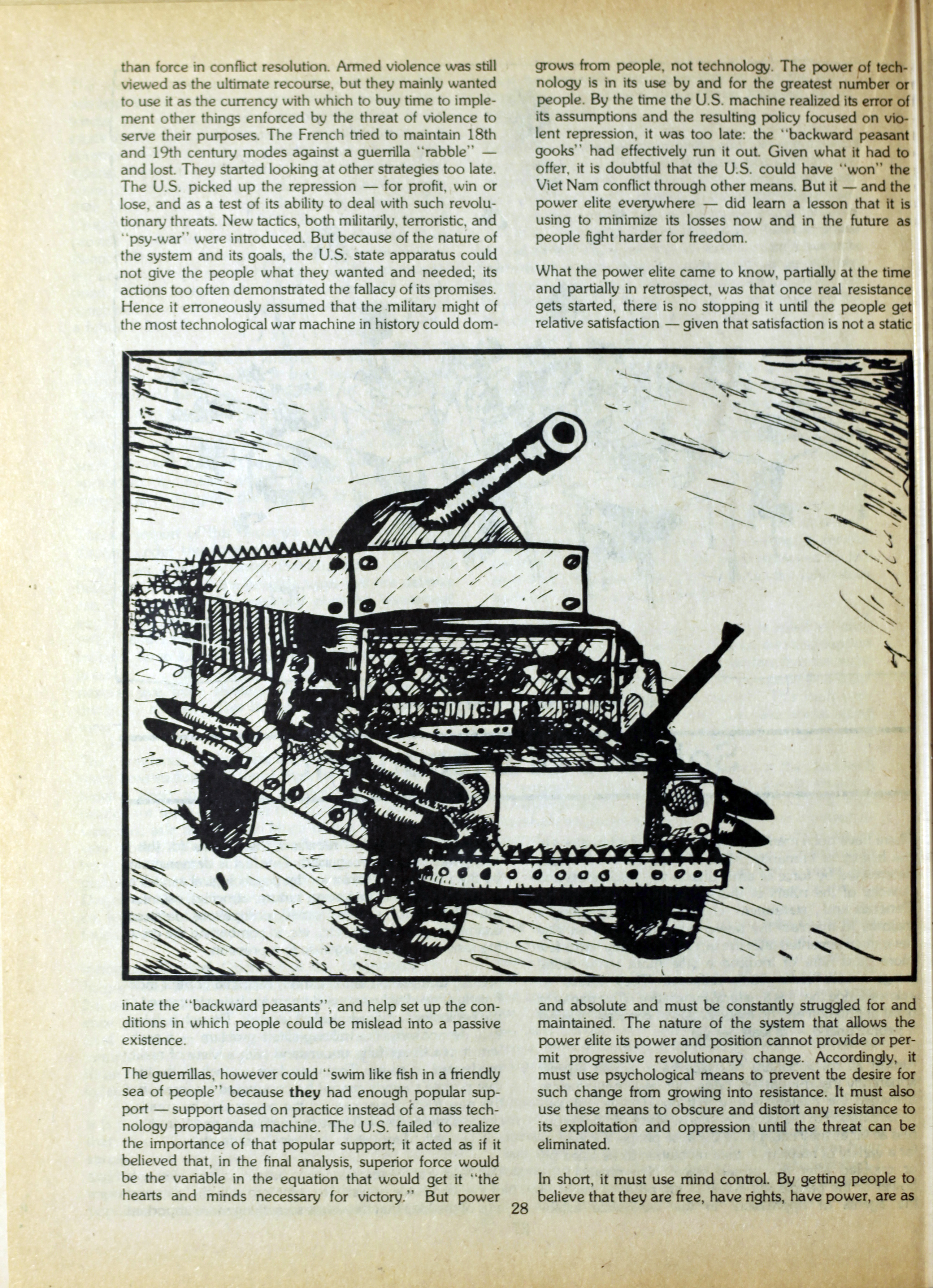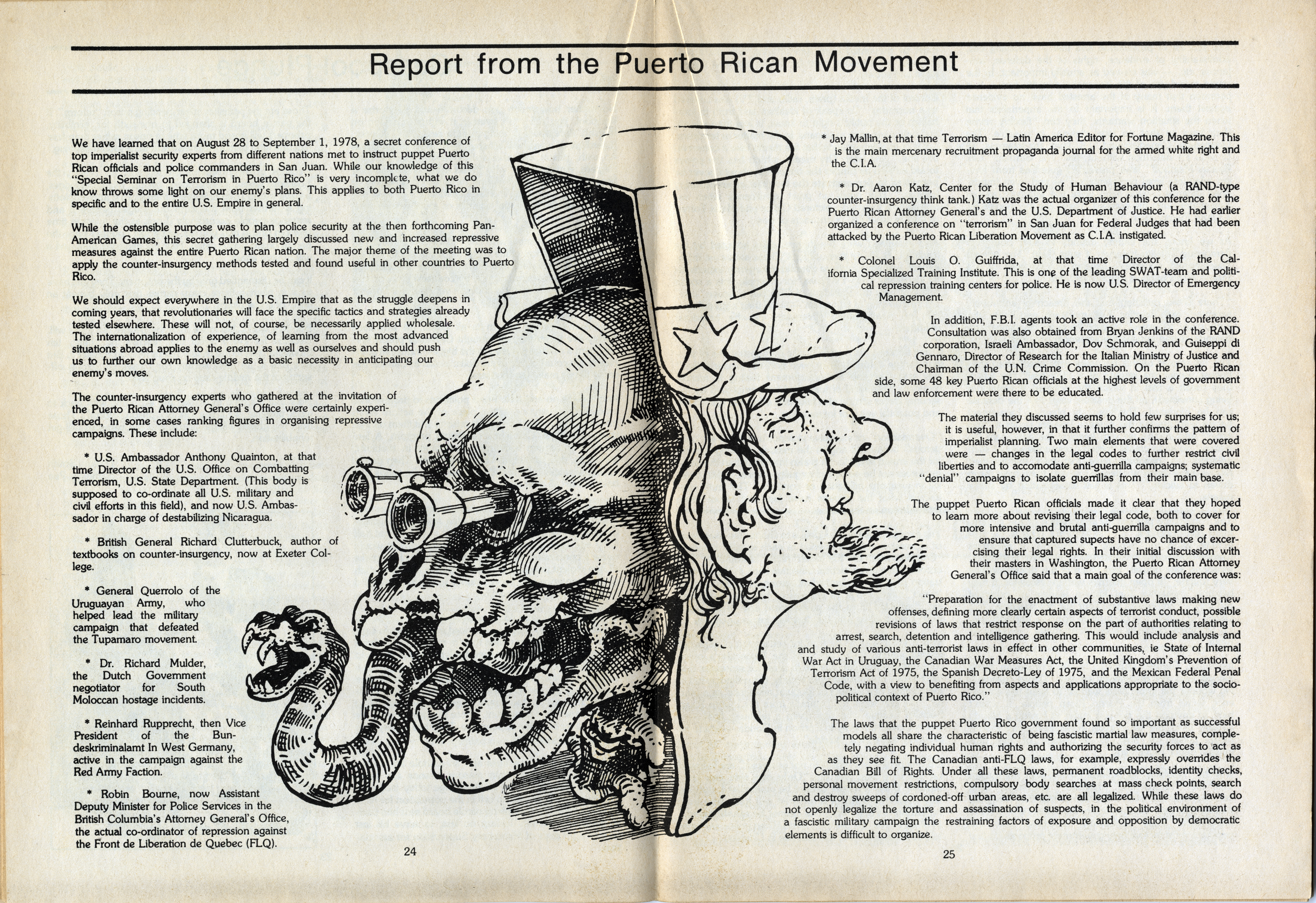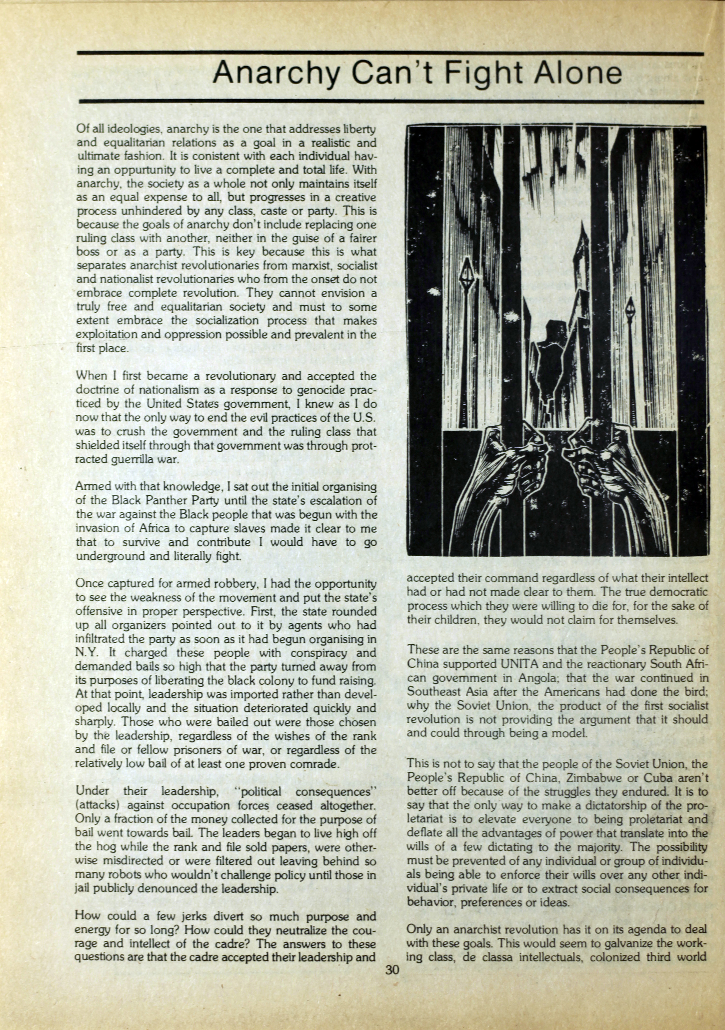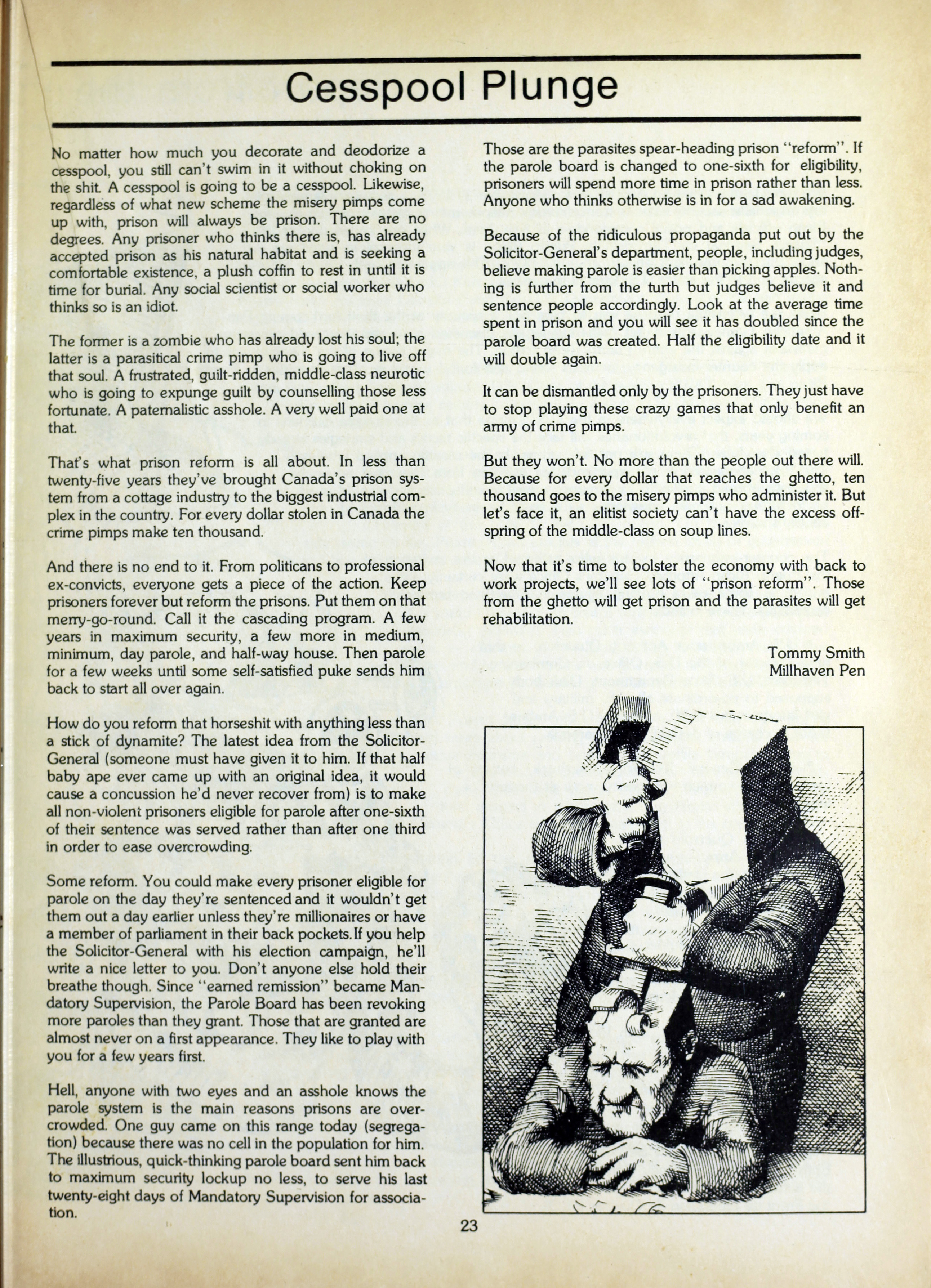An anarchist publication from Toronto made to support prisoners in various penal institutions. It began in 1980 and featured articles, letters, art, poetry etc. by prisoners and ex-prisoners. By Spring 1997 it had incorporated another journal called the Prison News Service and began to focus more on justice-related issues in Canada, namely: prisons, local jails, refugee detention centres, and First Nations self-determination. In this issue: "Introduction"; "Free the Vancouver Five" [poster title]; "Vancouver Five for life"; "Against the corporate state"; "Southern Buffalo spirit"; "Dakota revenge"; "Arizona State lock down"; "California dreaming"; "Cesspool plunge"; "Report from the Puerto Rican Movement"; "Soldiers of discontent"; "Anarchy can't fight alone"; "Prison, poverty, and power"; "Turtle Island under a cloud"; "Money appeal"; "Survival network"; "Ossining riot"; "Stepping on mocassin"; "Note from Walla Walla"; "Rape is still rape"; "Spiritual feasting"