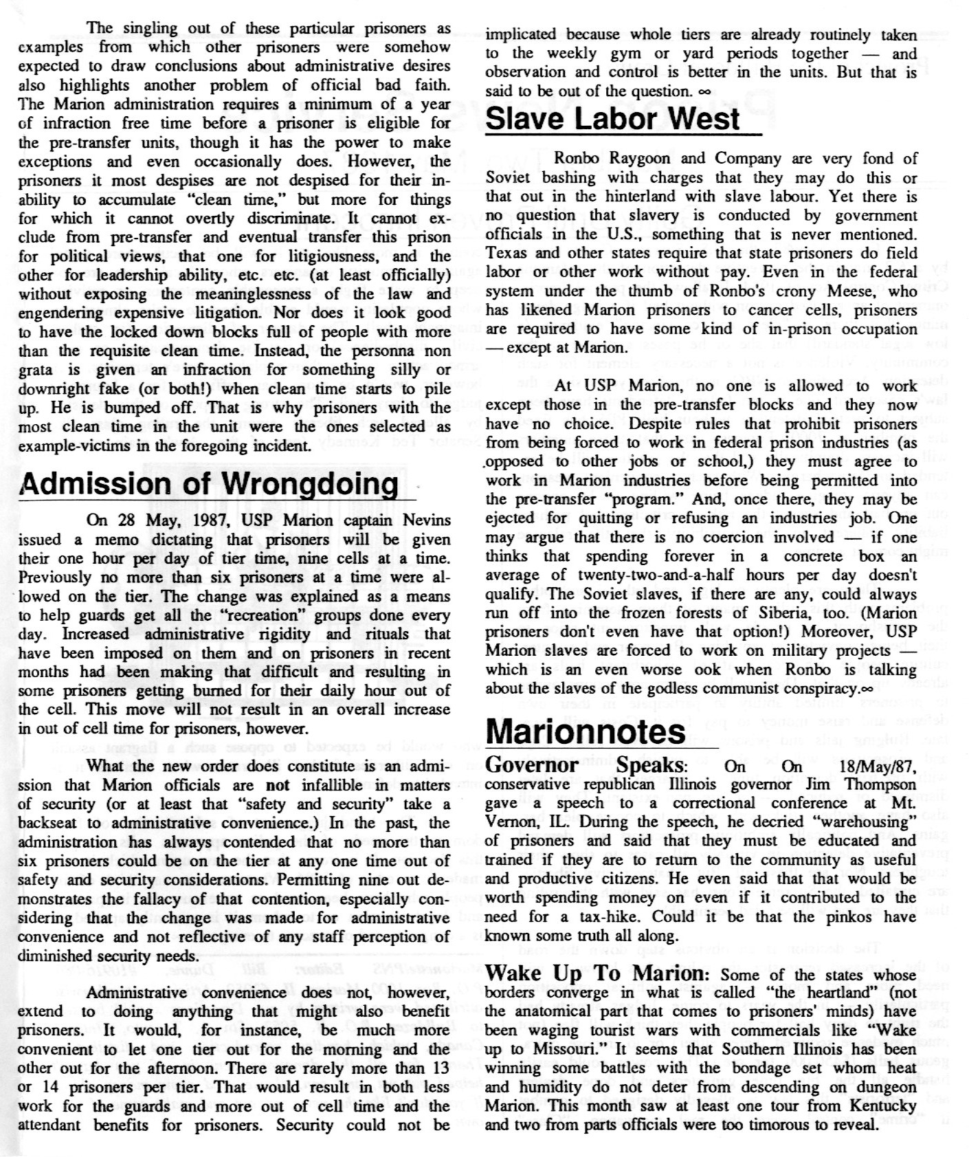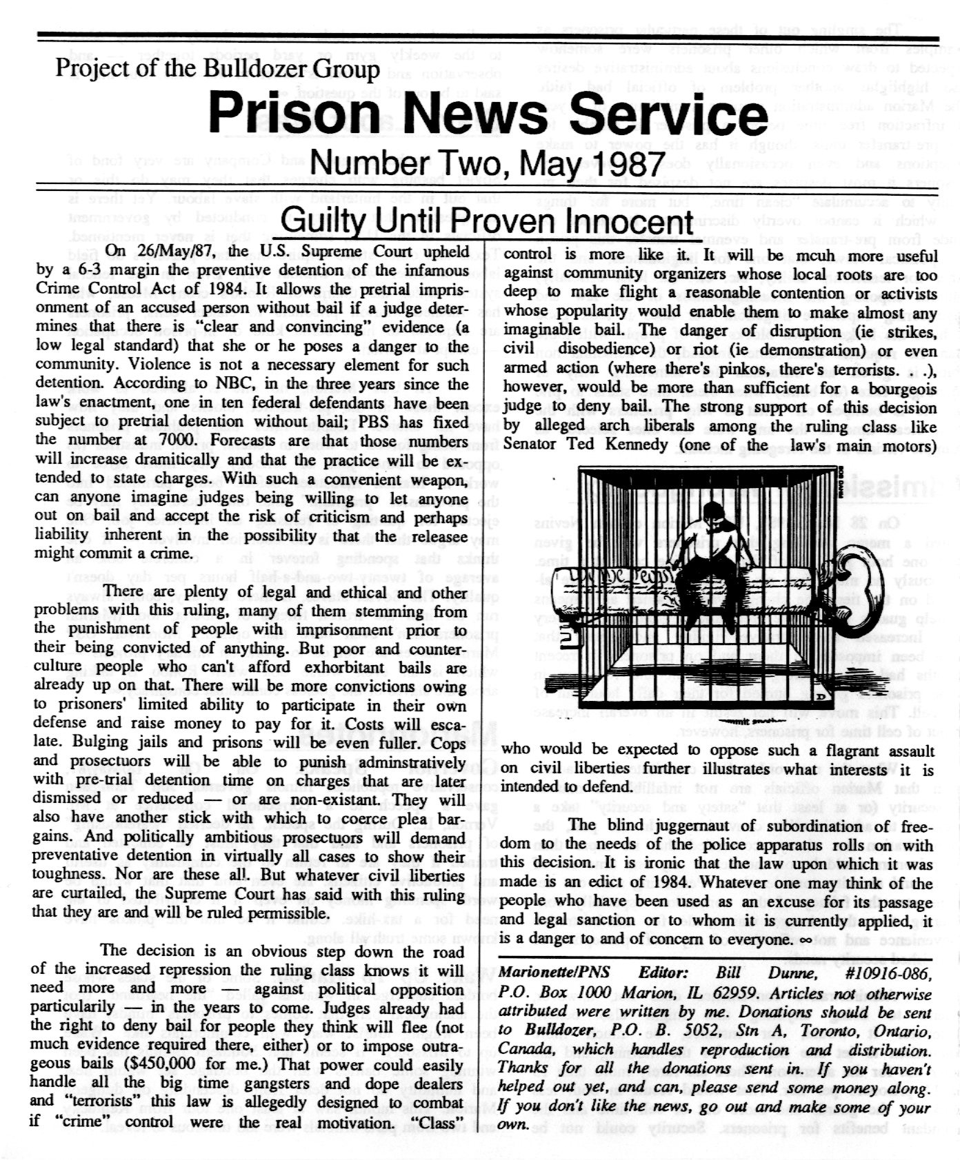 Edited by Bill Dunne. Article topics include: Harassment by trial, Admission of wrongdoing, Slave labor west, Marionnotes. PSN No. 2 May 1987, article topics include: Guilty until proven innocent, Community contagion [sic], Bumped off.