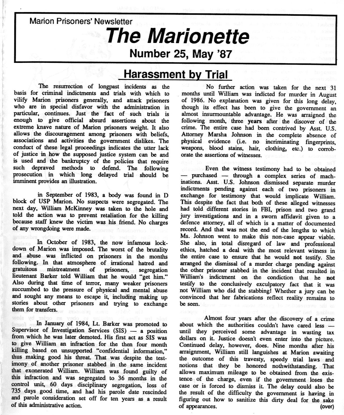 The Marionette is a prison newsletter made by prisoners for prisoners and the general public to spread awareness of the conditions prisons and in Marion Penitentiary, Illinois in particular. Later joined with Prison News Service (PNS) focused on political trials, repressive abuses of imprisonment and the resistance to such oppression.