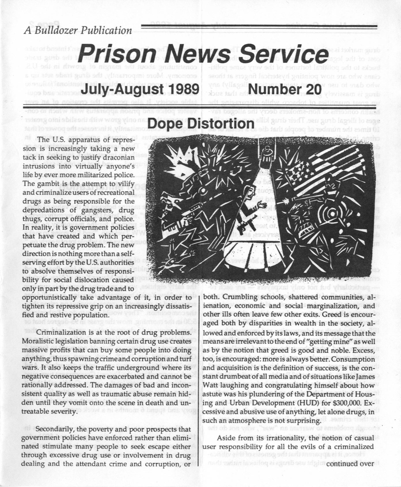 The Prison News Network (PNS) focuses on political trials, repressive abuses of imprisonment and the resistance to such oppression. It was joined with another existing prison periodical called Marionette made by prisoners for prisoners and the general public to spread awareness of the conditions prisons, Marion Penitentiary, Illinois in particular. Edited by Bill Dunne. Article topics include: Dope distortion, Prison militarization (from Ecomedia Toronto), Native prisoners denied sweatlodge, Prison system corruption, Get them while they're young (by the Sedition Committee), International notes, Bulldozer recommends "Your silence will not protect you" (cassette tape of works by Black and North American Indian poets and performers), German hunger strike ends (by correspondent), Prison myths about AIDS, American prisons punish AIDS victims (by Adam Starchild), An open letter to the progressive community (from the Emergency Committee for Political Prisoners) (Note: p. 8-9 is a double-page spread). Marionette, no. 44, July-August 1989. Article topics include: The wages of ?, Big brothers parasites, Donna departs (Donna H. Kolb, attorney), Marionnotes.