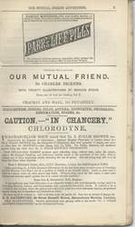 Last complete novel completed by Charles Dickens and is one of his most sophisticated works, combining savage satire with social analysis. In the opening chapters a body is found in the Thames and identified as that of John Harmon, a young man recently returned to London to receive his inheritance. Were he alive, his father's will would require him to marry Bella Wilfer, a beautiful, mercenary girl whom he had never met. Instead, the money passes to the working-class Boffins, and the effects spread into various corners of London society. Issued monthly from May 1864 to November 1865 in illustrated green paper covers. Chapters 1-4: Chapter 1. Lodgers in Queer Street -- Chapter 2. A respected friend in a new aspect -- Chapter 3. The same respected friend in more aspects than one -- Chapter 4. A happy return of the day