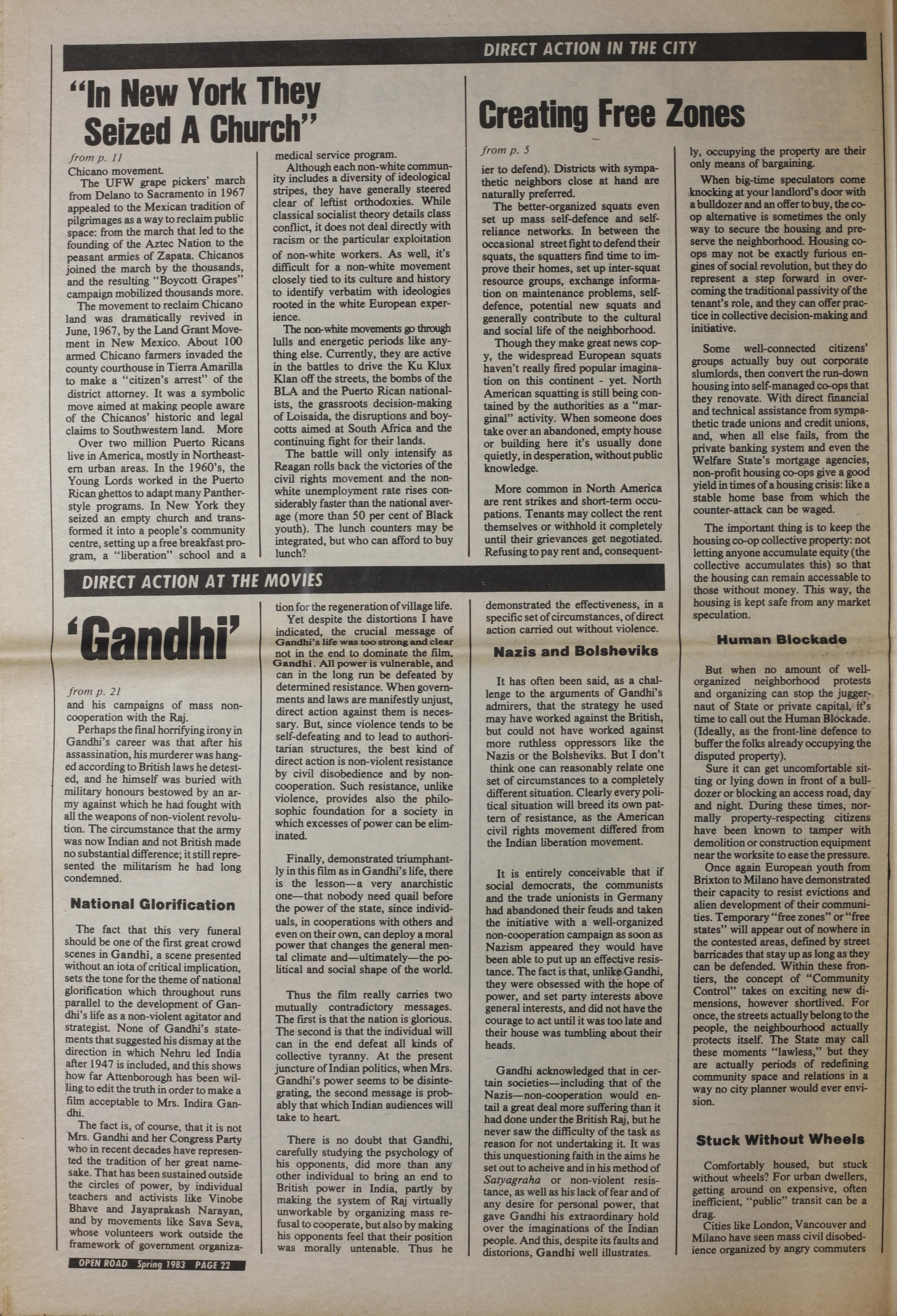 In this issue: Direct action: what is it? "A lifestyle of action"; Direct action on the job. "Working it out: giving them the gears"; Direct action in the city. "Waking up from the urban nightmare"; "Grassroots on rooftops"; Direct action on the air. "Touch that dial"; Direct action: loud and clear. "Shock, slogans and token tantrums"; Direct action for ourselves. "Nuclear family meltdown" by Fred Mobile; "Meaning of the tribes"; Open Road special report. "Trial by media: free the five"; "'Direct Action' scores twice"; "Porn fight catches fire"; "No more business as usual" by Mathew Garth; "Conspiracy: is to breathe together" by Procne Jones; "Pioneers in the healthy zone"; "The five: who are they?"; "A tale of two cities"; "Statement from the five: how we see it"; Direct action: doing it. "Interview with a social saboteur: action is addictive"; "Up against the wall"; Direct action against the nukes. "Clamshell clampdown" by Rudy Perkins; "Reflections in the barrel of a gun" by David Firman; Direct action at the movies. "'Ghandi': the price of glory" [movie review] by George Woodcock; Direct action at the check-out. "Cut food costs: bag those bargains"; "For the law-abiding ...".