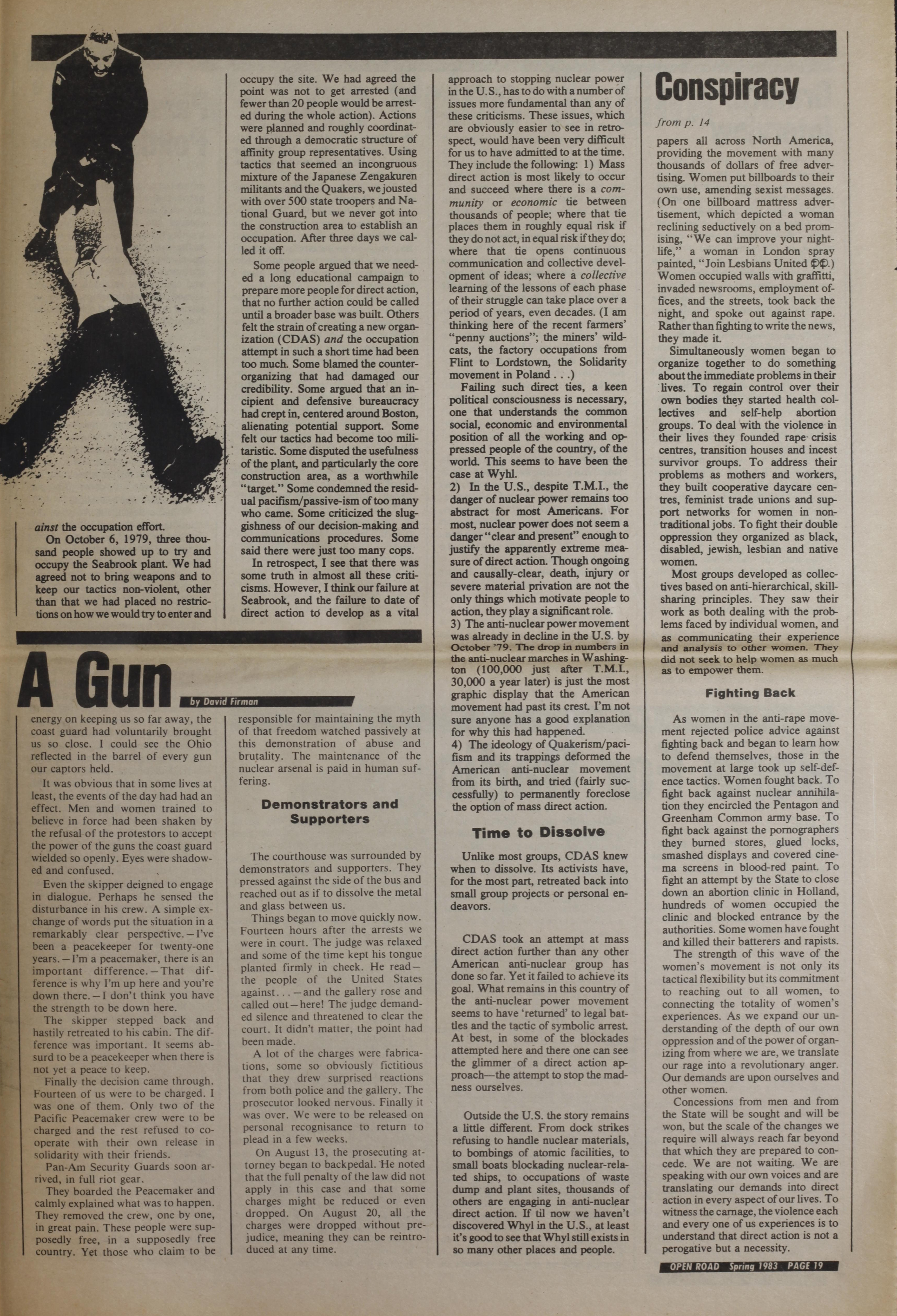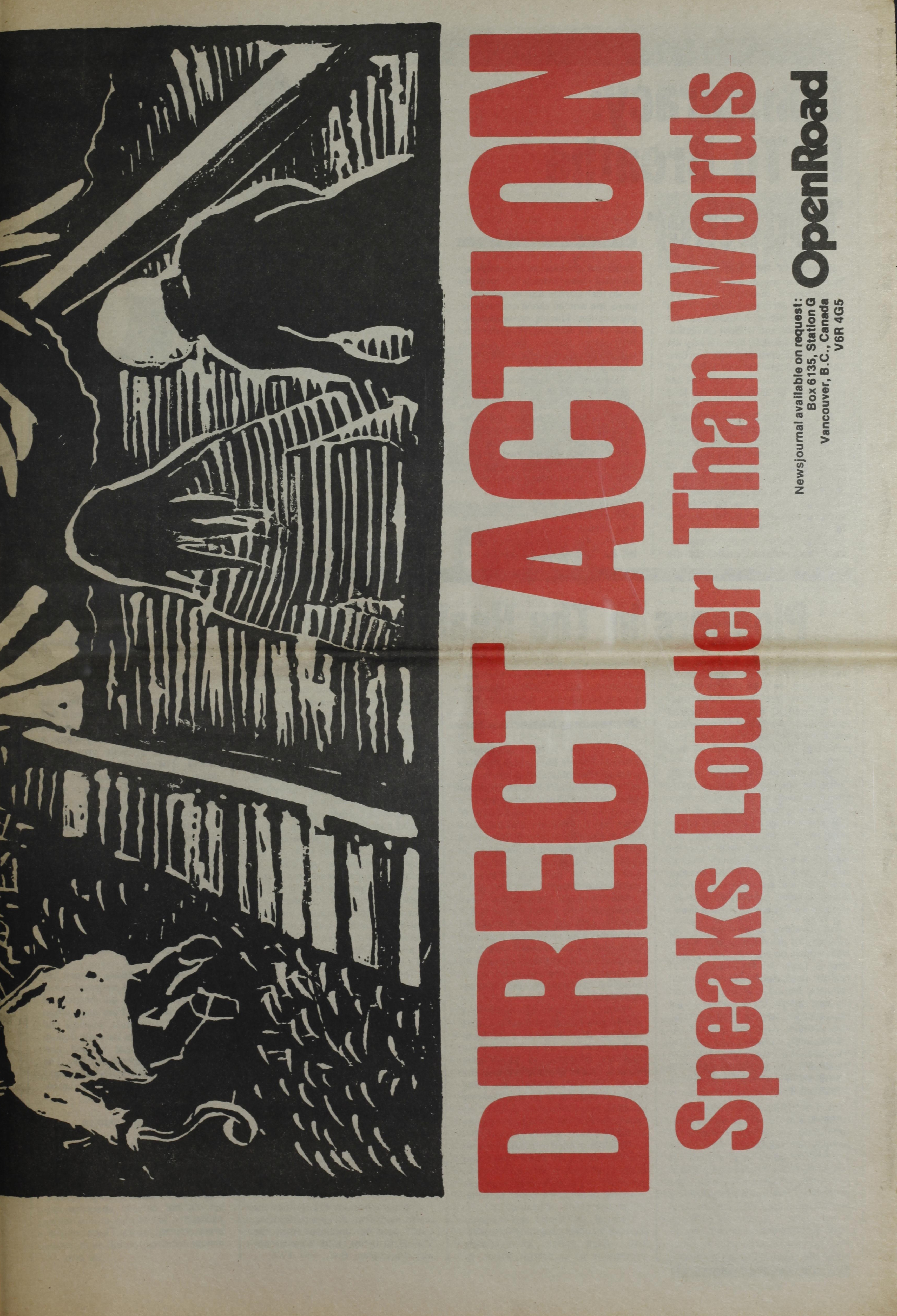 In this issue: Direct action: what is it? "A lifestyle of action"; Direct action on the job. "Working it out: giving them the gears"; Direct action in the city. "Waking up from the urban nightmare"; "Grassroots on rooftops"; Direct action on the air. "Touch that dial"; Direct action: loud and clear. "Shock, slogans and token tantrums"; Direct action for ourselves. "Nuclear family meltdown" by Fred Mobile; "Meaning of the tribes"; Open Road special report. "Trial by media: free the five"; "'Direct Action' scores twice"; "Porn fight catches fire"; "No more business as usual" by Mathew Garth; "Conspiracy: is to breathe together" by Procne Jones; "Pioneers in the healthy zone"; "The five: who are they?"; "A tale of two cities"; "Statement from the five: how we see it"; Direct action: doing it. "Interview with a social saboteur: action is addictive"; "Up against the wall"; Direct action against the nukes. "Clamshell clampdown" by Rudy Perkins; "Reflections in the barrel of a gun" by David Firman; Direct action at the movies. "'Ghandi': the price of glory" [movie review] by George Woodcock; Direct action at the check-out. "Cut food costs: bag those bargains"; "For the law-abiding ...".
