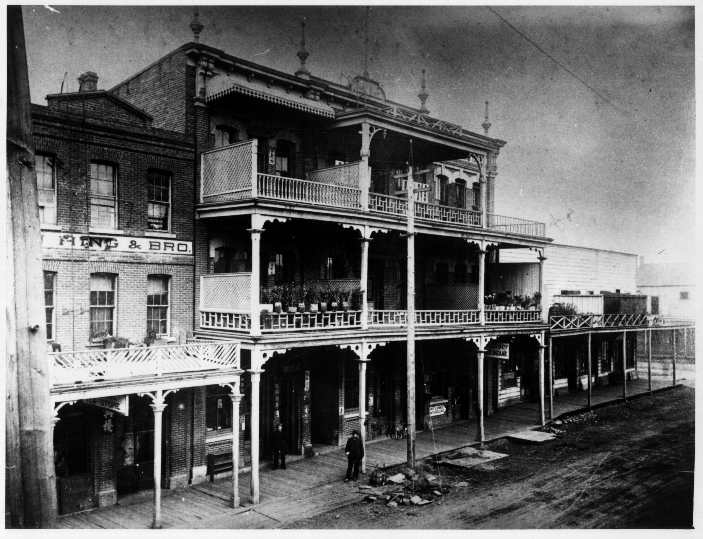 Shows the building of Chinese businesses on Fisgard Street, Victoria, B.C. This was the original home of CCBA. Built in 1885, 554-560 Fisgard Street. Architect: John Teague. Catalogue number: HP068226; Association number: 193501-001.