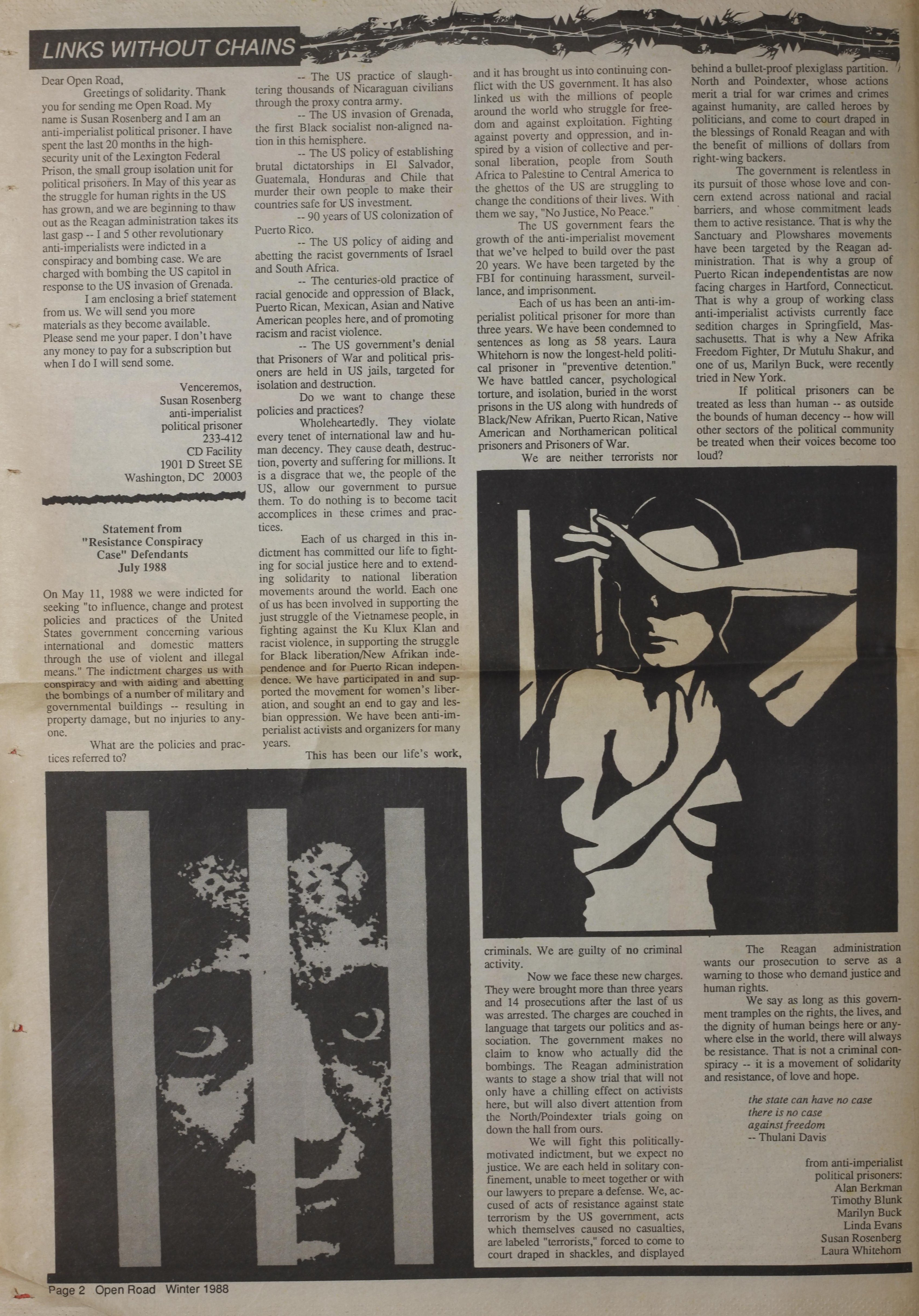 In this issue: "5-1=film"; Links without chains. "Statement from "Resistance Conspiracy Case" defendants July 1988". To struggle or.... "The issue is courage"; "Whether to flee or fight"; "Or to accomodate". Review. "Attention, MOVE! this is America by Margot Harry".