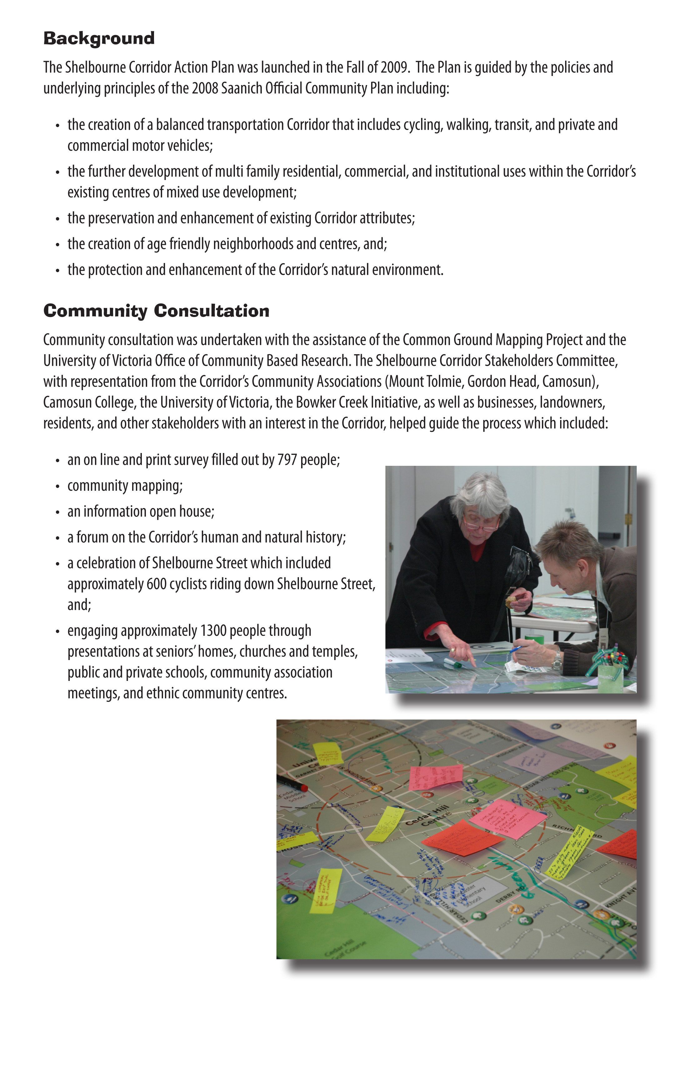 A map showing the Shelbourne Corridor study area between North Dairy Road and Feltham Road. The map collects locations where residents live, meet, play, and shop, as well as Bowker Creek, walking routes, and bus routes. Reverse of map features sections on the background of the action plan; the consultation process, survey highlights; and comments from participants. The initial Action Plan community consultation map and vision survey results are also included. This map is part of the Green Map System.
