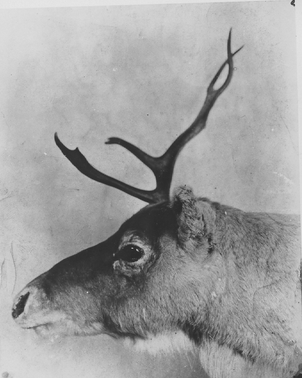 Dawson's caribou, also known as Queen Charlotte Islands caribou, distinguished by its small size and dull, mouse-grey color without dark-brown, black or white marks, is an extinct subspecies. Photo of a RBC Museum specimen.