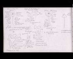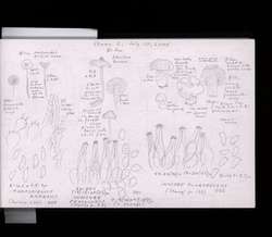 Field journal of mycofloristic (mushroom) surveys with detailed illustrations by Oluna Ceska. Each specimen has been labelled by name, as well as by the location, date, and substrate where it was found. Additional observations include physical characteristics, smell, size, and spore size. The research focuses primarily on the southern Vancouver island region. Many of the studied specimens are from Observatory Hill, Victoria. Additional research locations include the Gulf Islands, Haida Gwaii, the BC mainland, the Yukon, Washington, and Oregon. Locations visited in the journal include: Shawinigan Lake; Skirt Mountain; Sidney; Highlands; Harewood Planes; Nanaimo; Burnaby Island, Moresby Island, Kendrick Point, Haida Gwaii; Observatory Hill; Mesachie Lake; Metchosin Park Echo Lane Farm; Nanoose Bay; Royal Roads; Heal’s Rifle Range; Nanaimo; Cabbage Island; Portland Island; Salt Spring Island; Tall Timbers; McGillivray forest fire; Chase; Duncan; Rocky Point, DND; Ross Island; Kunghit Island; Raspberry Cove; Jordan River; Nitihaht Hatchery; SVIMS Show; Glinz Lake; Galiano Island; Trout Lake, WA; Mount Kobau, Osoyoos; Langford; Mount Wells; Tod Inlet; Ucluelet; Christmas Hill; Island View Beach.