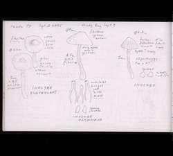 Field journal of mycofloristic (mushroom) surveys with detailed illustrations by Oluna Ceska. Each specimen has been labelled by name, as well as by the location, date, and substrate where it was found. Additional observations include physical characteristics, smell, size, and spore size. The research focuses primarily on the southern Vancouver island region. Many of the studied specimens are from Observatory Hill, Victoria. Additional research locations include the Gulf Islands, Haida Gwaii, the BC mainland, the Yukon, Washington, and Oregon. Locations visited in the journal include: Shawinigan Lake; Skirt Mountain; Sidney; Highlands; Harewood Planes; Nanaimo; Burnaby Island, Moresby Island, Kendrick Point, Haida Gwaii; Observatory Hill; Mesachie Lake; Metchosin Park Echo Lane Farm; Nanoose Bay; Royal Roads; Heal’s Rifle Range; Nanaimo; Cabbage Island; Portland Island; Salt Spring Island; Tall Timbers; McGillivray forest fire; Chase; Duncan; Rocky Point, DND; Ross Island; Kunghit Island; Raspberry Cove; Jordan River; Nitihaht Hatchery; SVIMS Show; Glinz Lake; Galiano Island; Trout Lake, WA; Mount Kobau, Osoyoos; Langford; Mount Wells; Tod Inlet; Ucluelet; Christmas Hill; Island View Beach.