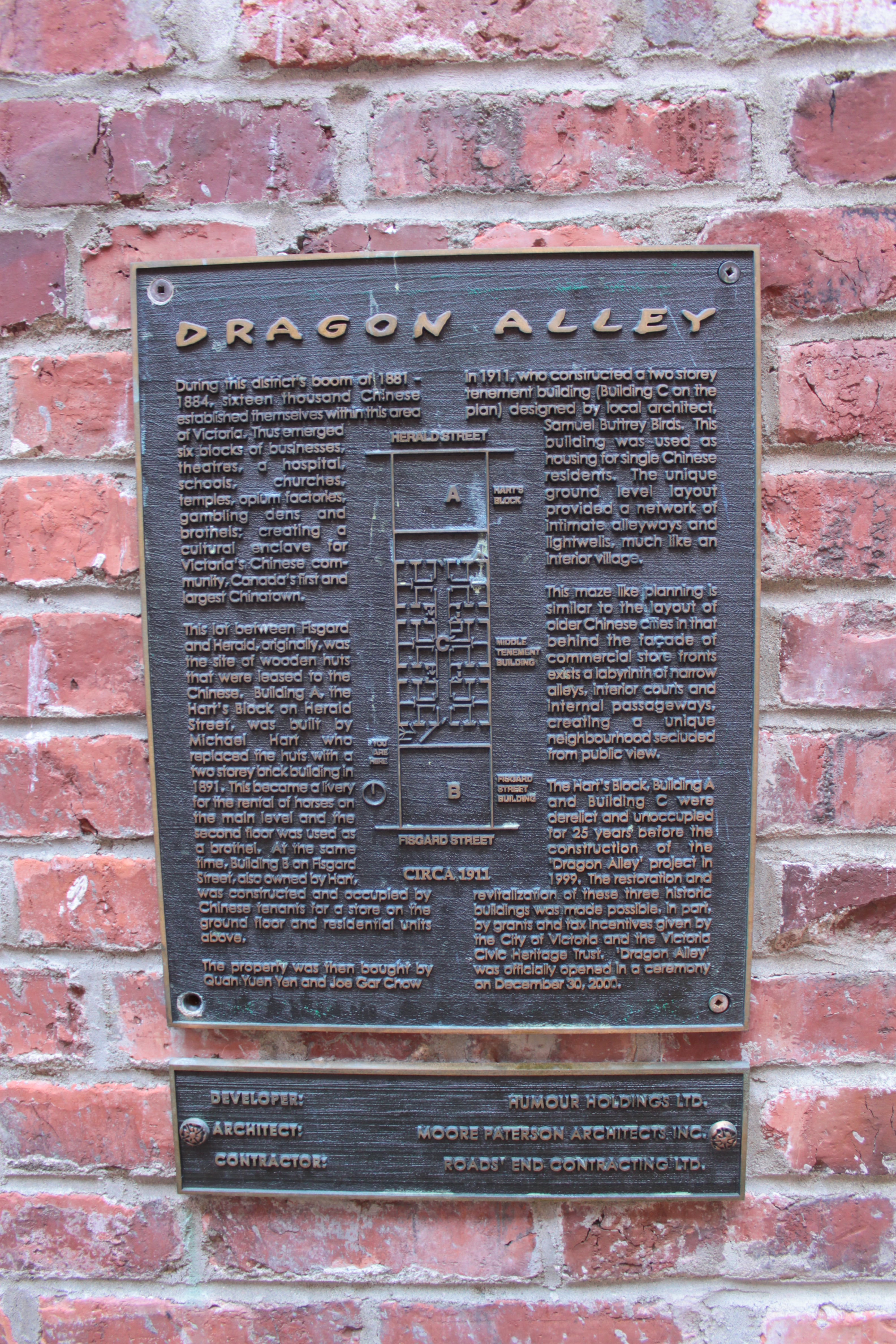 Plaque of Dragon Alley located in Chinatown, Vitoria B.C. From 1881 to 1884, Chinese immigrants established themselves over 6 blocks creating a cultural enclave for Victoria's Chinese community. A restoration was completed in 2000 and the area is inhabited with shops and apartments.