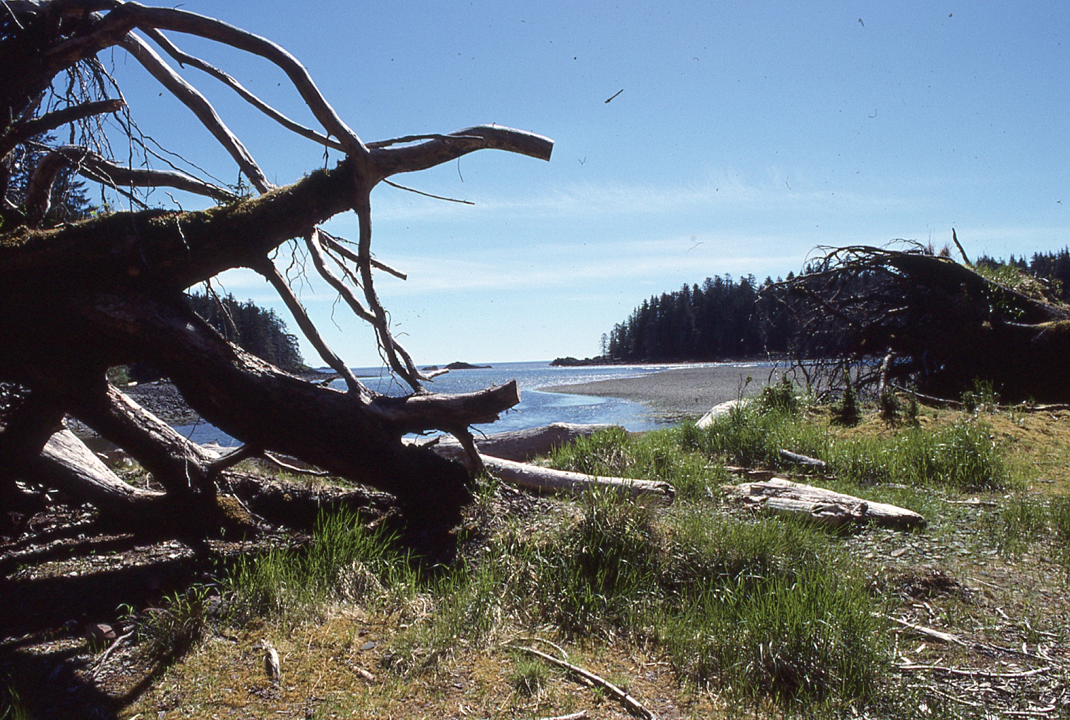 Photo of the Windy Bay estuary with the island's coast and forests in background. Windy Bay was once the site of a major Haida village and later became a summer fishing village. In mid-1980s, Windy Bay was the site where the Haida protested logging in Gwaii Haanas and in 2010 the Gwaii Haanas National Park Reserve and Haida Heritage Site was jointly established.