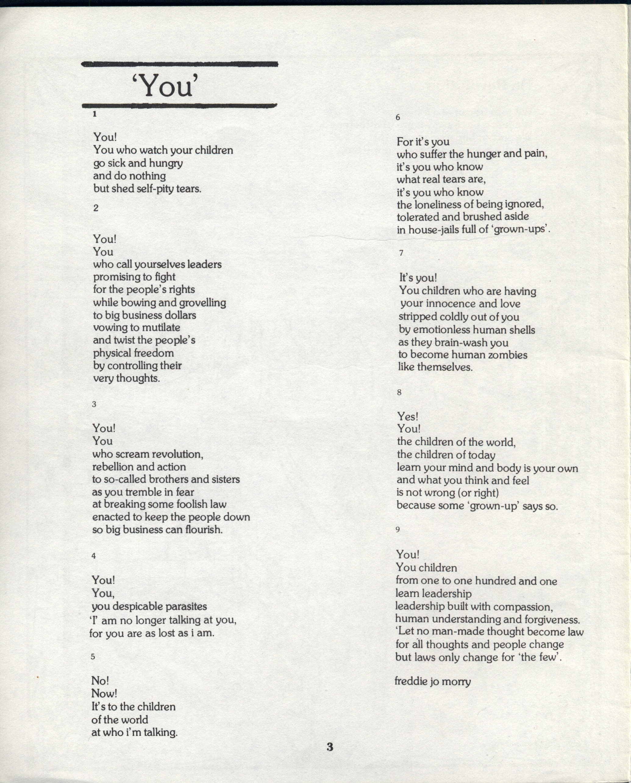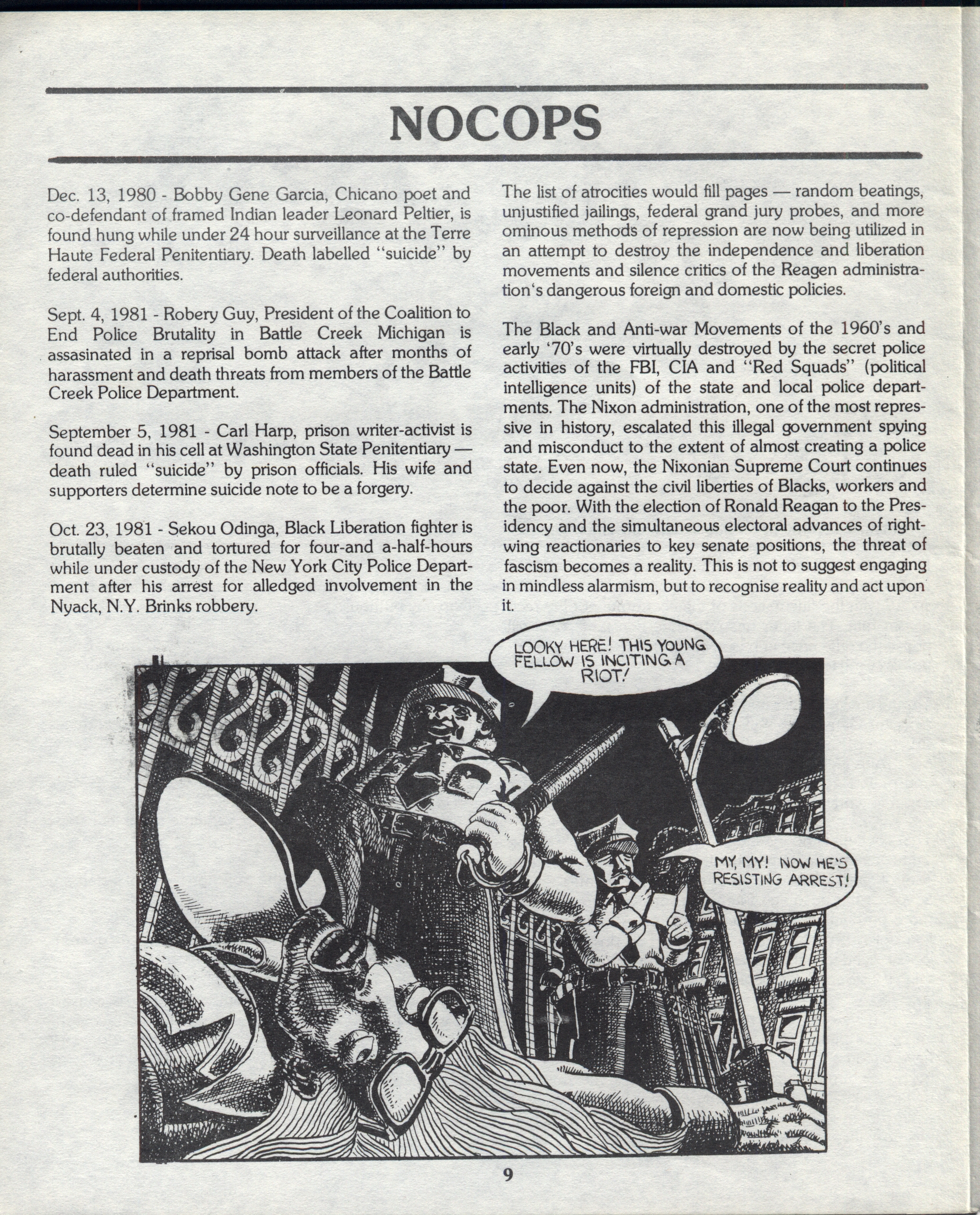 An anarchist publication from Toronto made to support prisoners in various penal institutions. It began in 1980 and featured articles, letters, art, poetry etc. by prisoners and ex-prisoners. By Spring 1997 it had incorporated another journal called the Prison News Service and began to focus more on justice-related issues in Canada, namely: prisons, local jails, refugee detention centres, and First Nations self-determination. In this issue: Introduction ; On revolution, Carl Harp, 1949-1981 ; You / Freddie Jo Morry ; Rehabilitation Marion style / Standing Deer ; Elimination ; Prison vortex / Rim England ; Economic barbarism / Tommy Smith ; Nocops ; Sexual exploitation / Carol Ann Wilds [printed first in WomanKind, also printed in Matrix] ; In process ; Cold knife ; The women / Anna G. Rodrigues ; Parasite elimination / Tommy Smith ; Realistic reform? / Winston Holloway ; Resistance ; Urgent request / Chs-ne-o-na-eh ; Thanks from Winston / Winston Holloway ; Society of the people struggling to be free [originally appeared in the Ubessey, the student newspaper at the University of British Columbia] ; Yellow Thunder Camp ; Lewisburg Council ; Simmons wins ; Native prisoners / Ted Ruark ; It's my life / Paris Carriger ; Spokane brutality trial ; The hole truth ; Personal cuts ; Feast or famine / Speeding Bull Capoeman ; Be here, see ; Money blues / Tommy Smith ; It doesn't matter / Tim England ; The mountain speaks / Ches-ne-o-na-eh ; Irish error