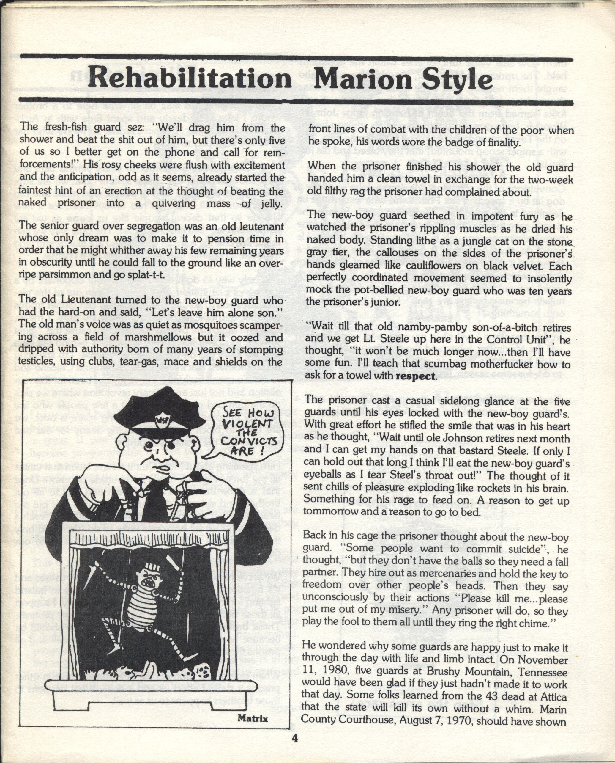 An anarchist publication from Toronto made to support prisoners in various penal institutions. It began in 1980 and featured articles, letters, art, poetry etc. by prisoners and ex-prisoners. By Spring 1997 it had incorporated another journal called the Prison News Service and began to focus more on justice-related issues in Canada, namely: prisons, local jails, refugee detention centres, and First Nations self-determination. In this issue: Introduction ; On revolution, Carl Harp, 1949-1981 ; You / Freddie Jo Morry ; Rehabilitation Marion style / Standing Deer ; Elimination ; Prison vortex / Rim England ; Economic barbarism / Tommy Smith ; Nocops ; Sexual exploitation / Carol Ann Wilds [printed first in WomanKind, also printed in Matrix] ; In process ; Cold knife ; The women / Anna G. Rodrigues ; Parasite elimination / Tommy Smith ; Realistic reform? / Winston Holloway ; Resistance ; Urgent request / Chs-ne-o-na-eh ; Thanks from Winston / Winston Holloway ; Society of the people struggling to be free [originally appeared in the Ubessey, the student newspaper at the University of British Columbia] ; Yellow Thunder Camp ; Lewisburg Council ; Simmons wins ; Native prisoners / Ted Ruark ; It's my life / Paris Carriger ; Spokane brutality trial ; The hole truth ; Personal cuts ; Feast or famine / Speeding Bull Capoeman ; Be here, see ; Money blues / Tommy Smith ; It doesn't matter / Tim England ; The mountain speaks / Ches-ne-o-na-eh ; Irish error