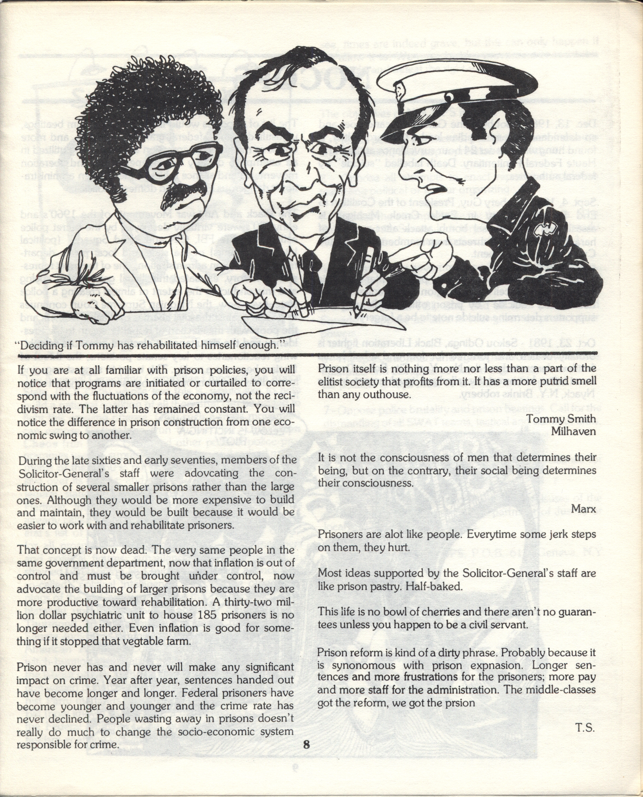 An anarchist publication from Toronto made to support prisoners in various penal institutions. It began in 1980 and featured articles, letters, art, poetry etc. by prisoners and ex-prisoners. By Spring 1997 it had incorporated another journal called the Prison News Service and began to focus more on justice-related issues in Canada, namely: prisons, local jails, refugee detention centres, and First Nations self-determination. In this issue: Introduction ; On revolution, Carl Harp, 1949-1981 ; You / Freddie Jo Morry ; Rehabilitation Marion style / Standing Deer ; Elimination ; Prison vortex / Rim England ; Economic barbarism / Tommy Smith ; Nocops ; Sexual exploitation / Carol Ann Wilds [printed first in WomanKind, also printed in Matrix] ; In process ; Cold knife ; The women / Anna G. Rodrigues ; Parasite elimination / Tommy Smith ; Realistic reform? / Winston Holloway ; Resistance ; Urgent request / Chs-ne-o-na-eh ; Thanks from Winston / Winston Holloway ; Society of the people struggling to be free [originally appeared in the Ubessey, the student newspaper at the University of British Columbia] ; Yellow Thunder Camp ; Lewisburg Council ; Simmons wins ; Native prisoners / Ted Ruark ; It's my life / Paris Carriger ; Spokane brutality trial ; The hole truth ; Personal cuts ; Feast or famine / Speeding Bull Capoeman ; Be here, see ; Money blues / Tommy Smith ; It doesn't matter / Tim England ; The mountain speaks / Ches-ne-o-na-eh ; Irish error