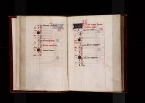 - Bound in nineteenth century red morocco; gilt-stamped border of vine leaves with corner flowers on front and back; spine with four raised bands and gilt stamping; all edges gilt. Inscription on front flyleaf: "Ce Manuscrit a appartenu au Duc de la Vallie`re qui l'avait de l'Eveque de St Denis, il proviend[...?] de la Bibliotheque Royale de Versailles. Il est du 15e Sie`cle."