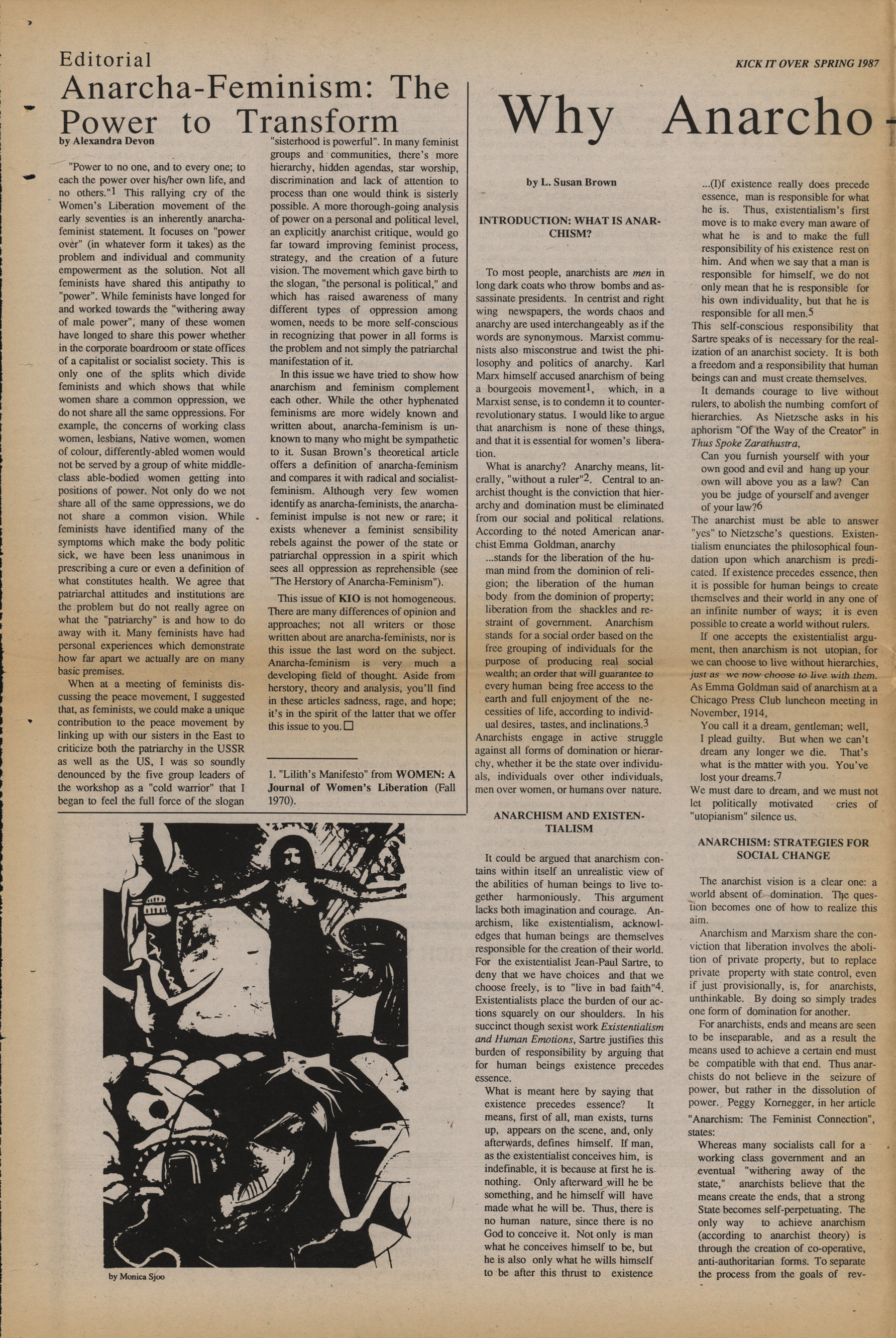A social anarchist and anti-authoritarian quarterly publication. In this issue: "Anarcha-feminism" - Interview with Lizzie Borden, Herstory of anarcha-feminism, Genital mutilation, Greenham Common memoirs, The "other" womyn's music, Women in India.