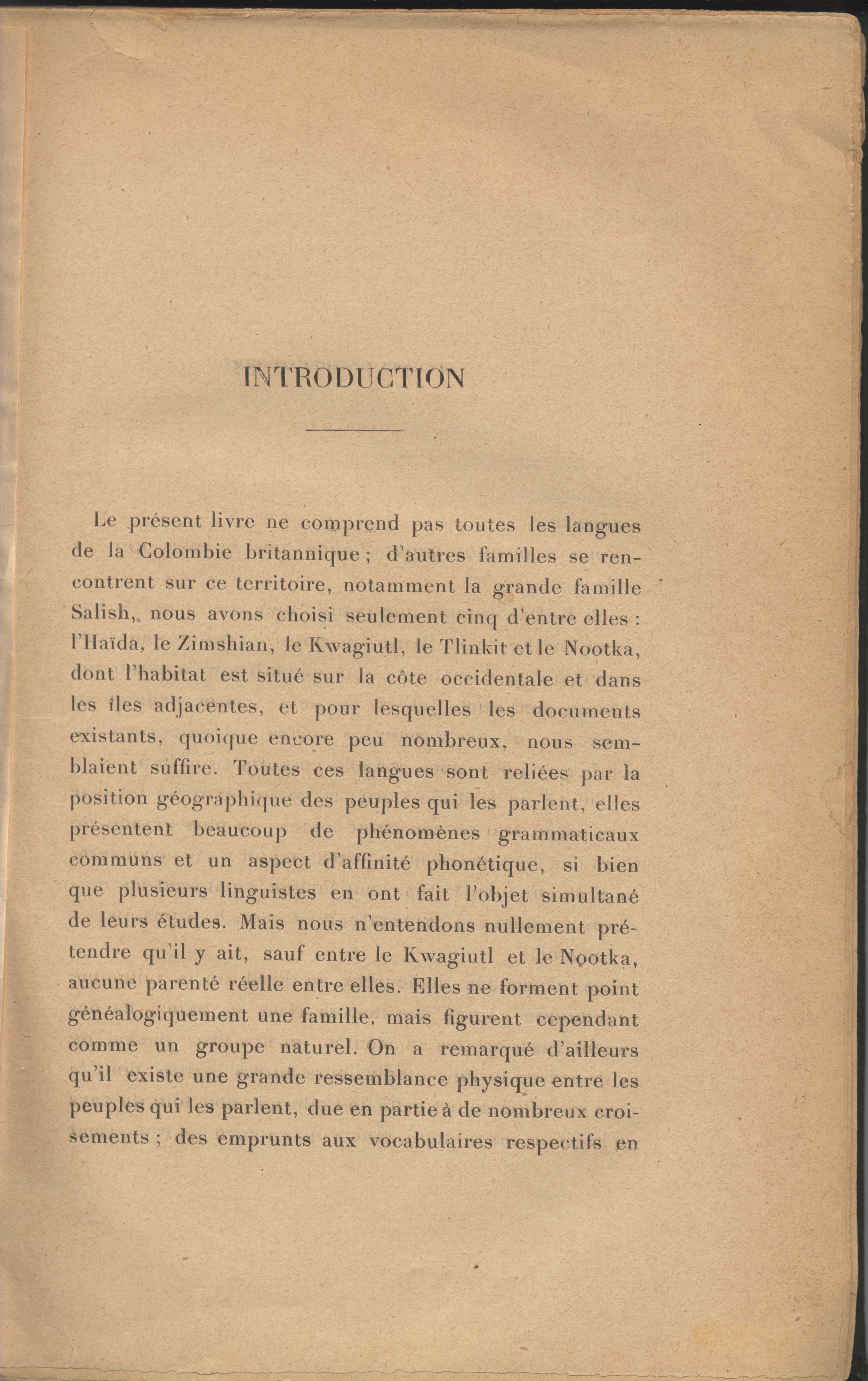 Written in French and focuses on the grammar and usages of five languages in British Columbia namely: Haida, Tshimshian, Kwagiutl, Nootka, and Tlinkit.