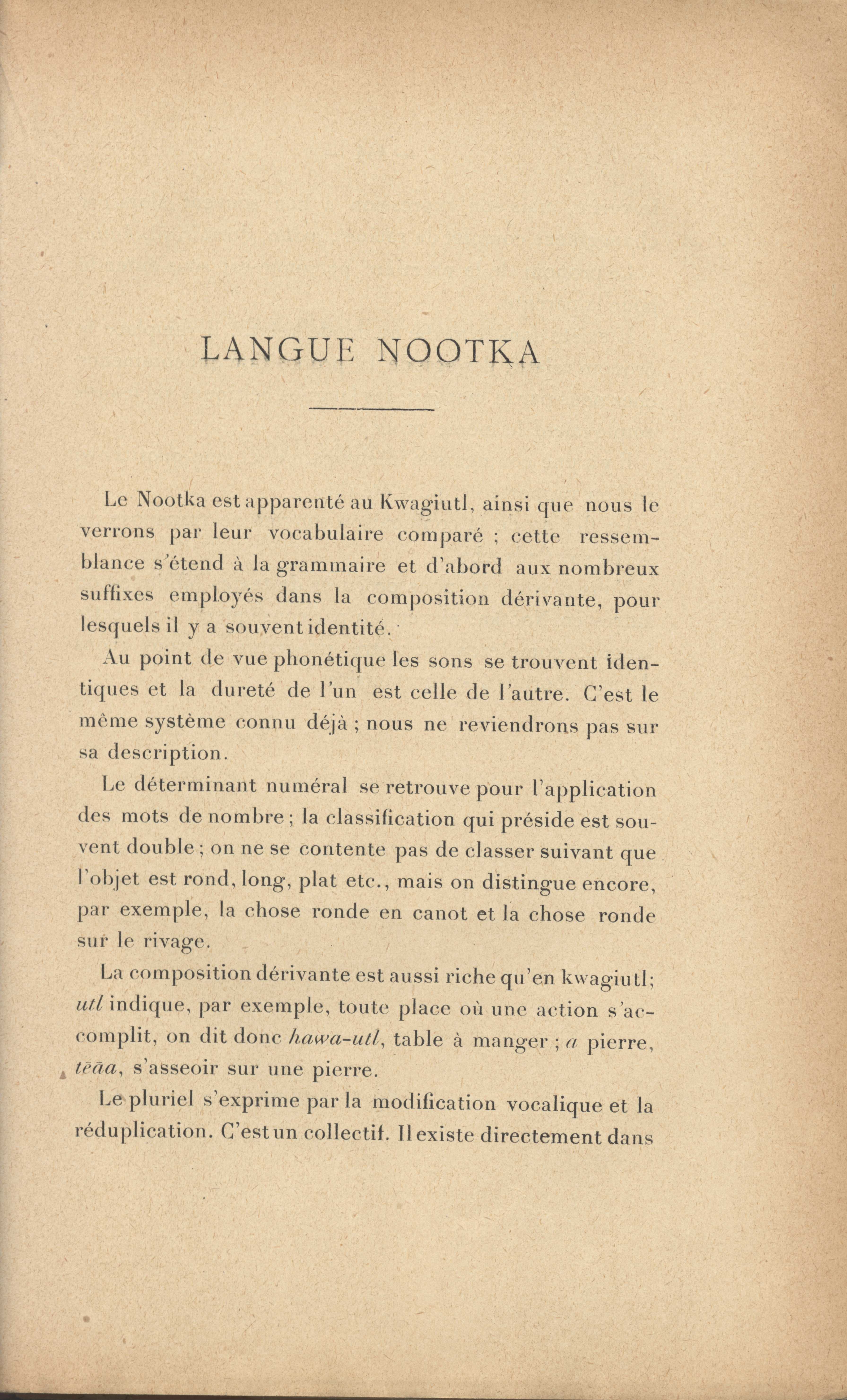 Written in French and focuses on the grammar and usages of five languages in British Columbia namely: Haida, Tshimshian, Kwagiutl, Nootka, and Tlinkit.