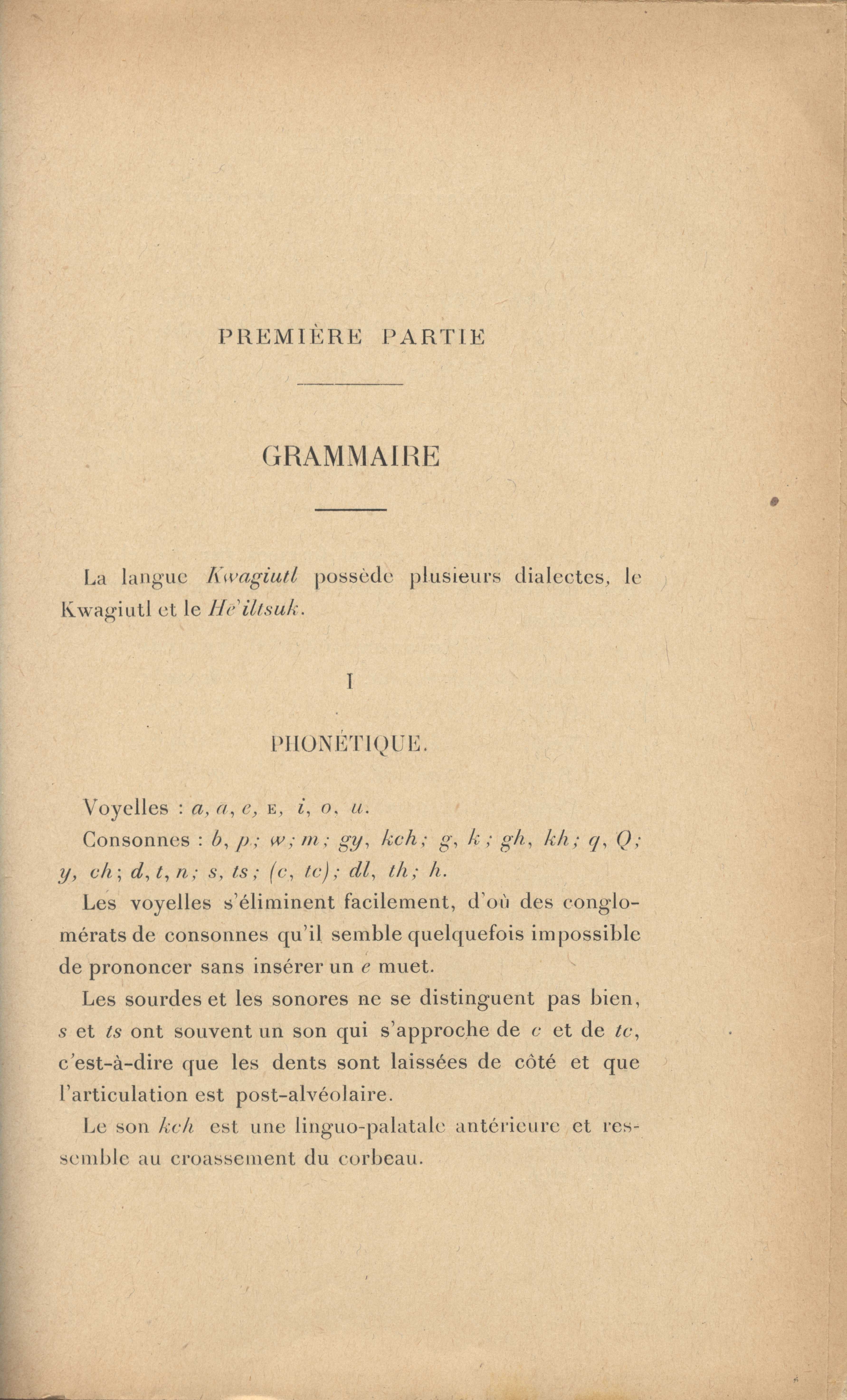 Written in French and focuses on the grammar and usages of five languages in British Columbia namely: Haida, Tshimshian, Kwagiutl, Nootka, and Tlinkit.