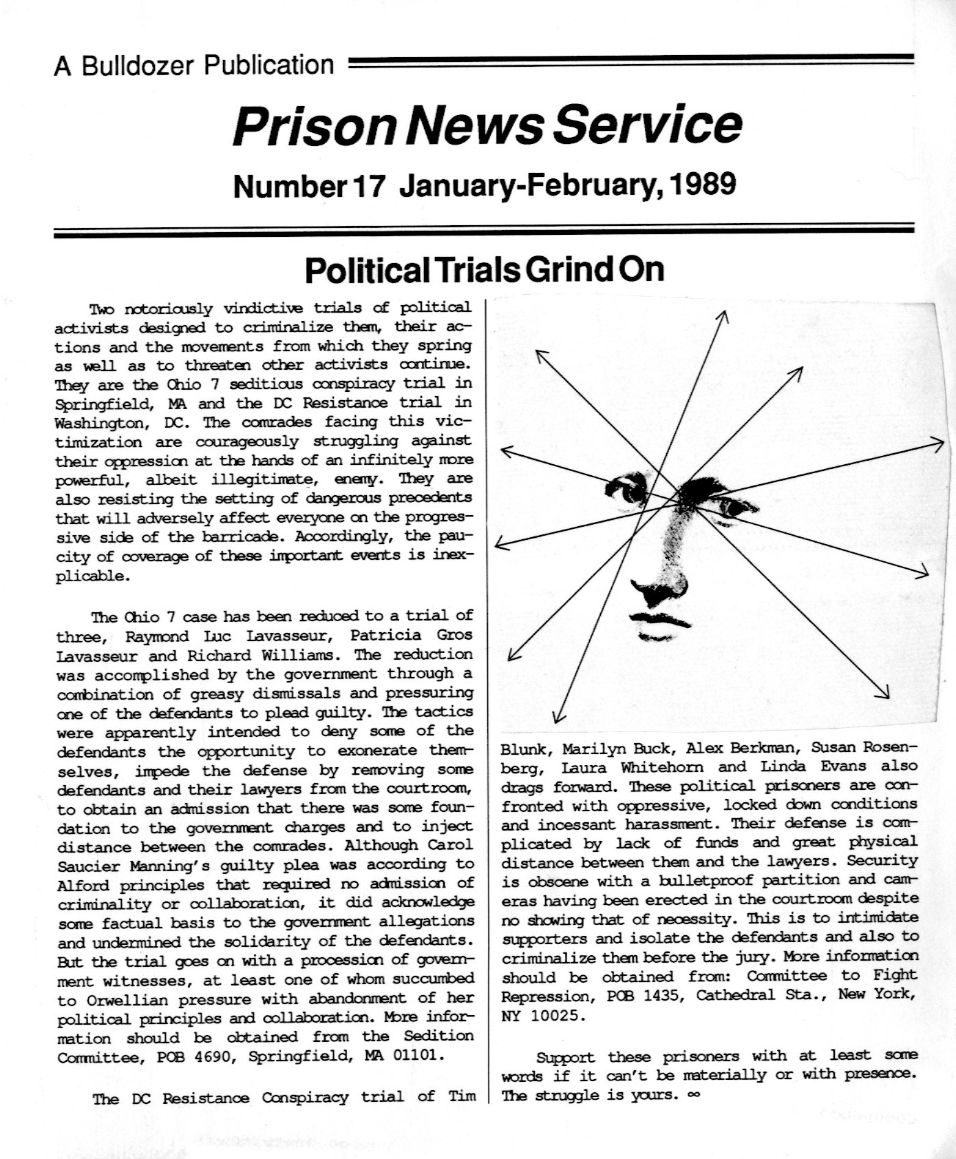 The Prison News Network (PNS) focuses on political trials, repressive abuses of imprisonment and the resistance to such oppression. It was joined with another existing prison periodical called Marionette made by prisoners for prisoners and the general public to spread awareness of the conditions prisons, Marion Penitentiary, Illinois in particular. Edited by Bill Dunne. Article topics include: Political trials grind on, The conspiracy of social engineering, More official murder, AIDS action in Toronto, Prison AIDS information, Emerging from the shadows, Bombing suspect setup. (Note: p. 6-7 is a double-page spread). Marionette, no. 41, January-February 1989. Article topics include: Poseur press pillories prisoners, Marionnotes, Swines' suicide scam, Clean water rumor.