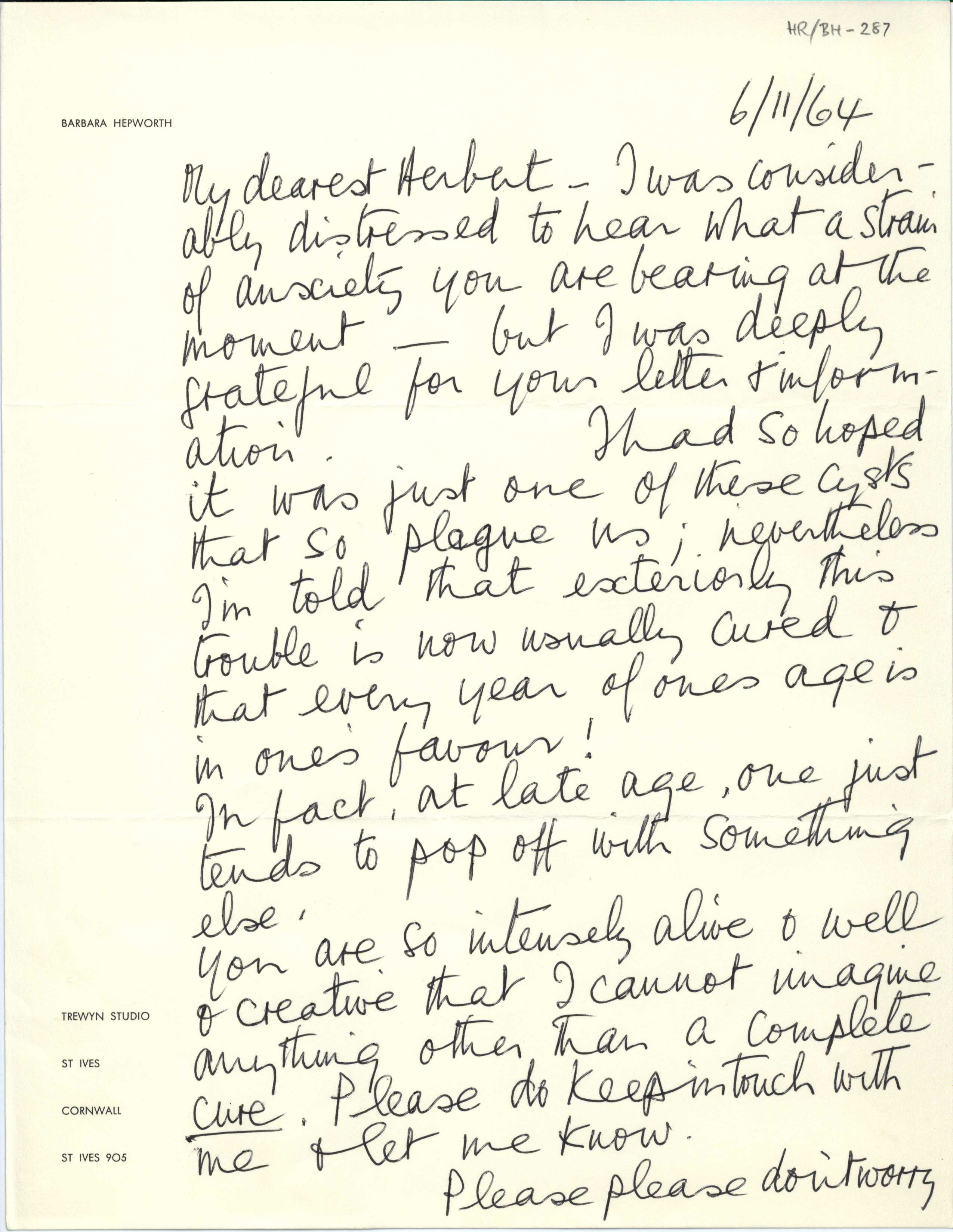 Letter from Barbara Hepworth to Herbert Read, November 06, 1964