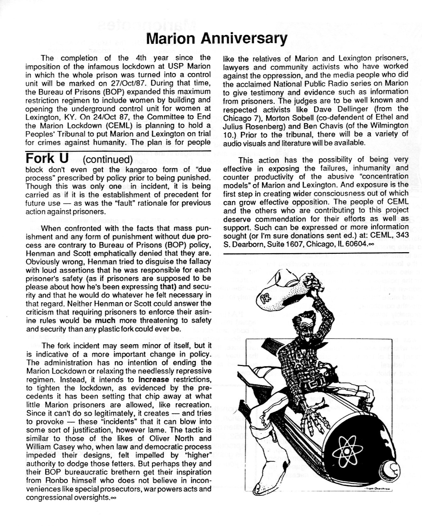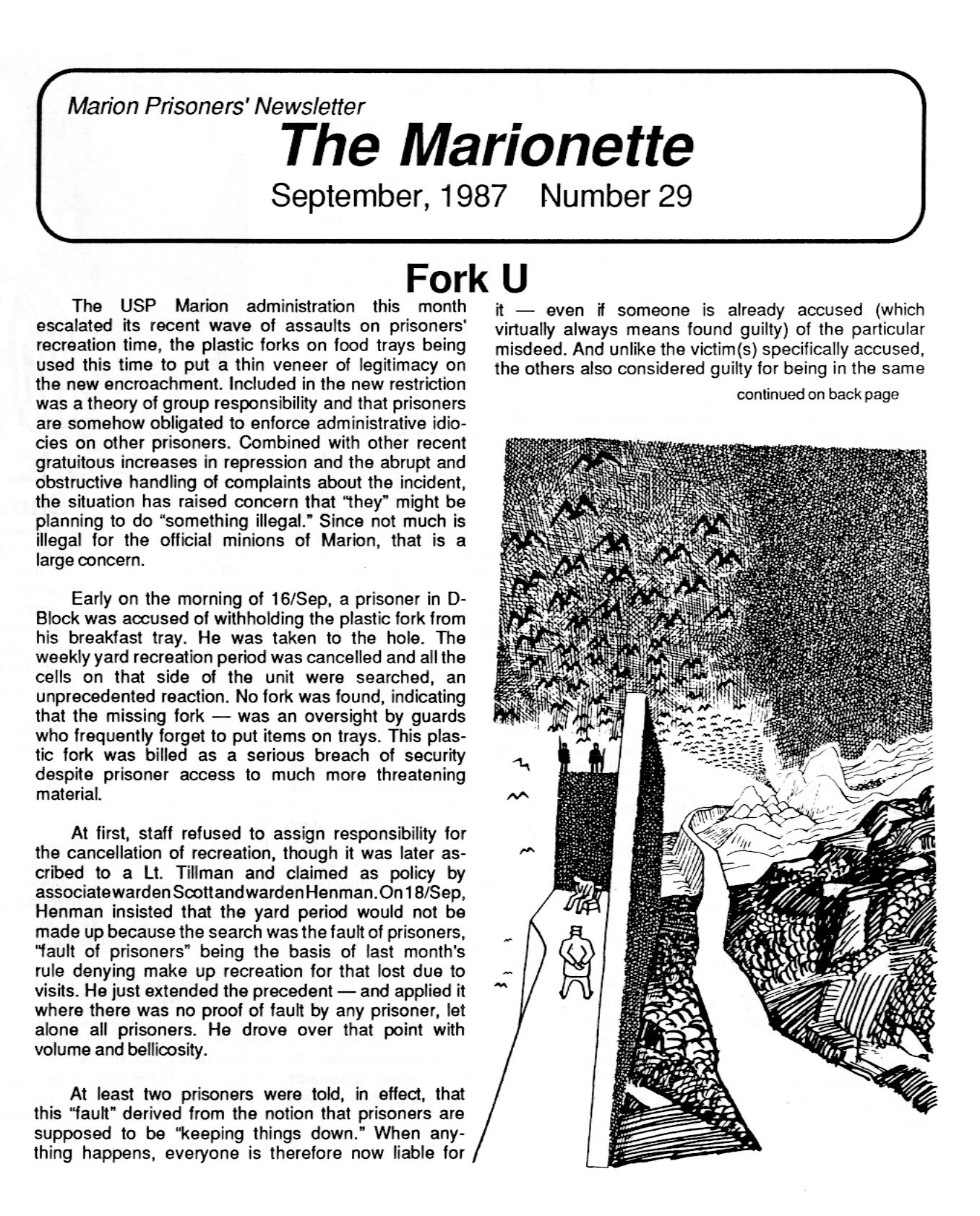 The Marionette is a prison newsletter made by prisoners for prisoners and the general public to spread awareness of the conditions prisons and in Marion Penitentiary, Illinois in particular. Later joined with Prison News Service (PNS) focused on political trials, repressive abuses of imprisonment and the resistance to such oppression.