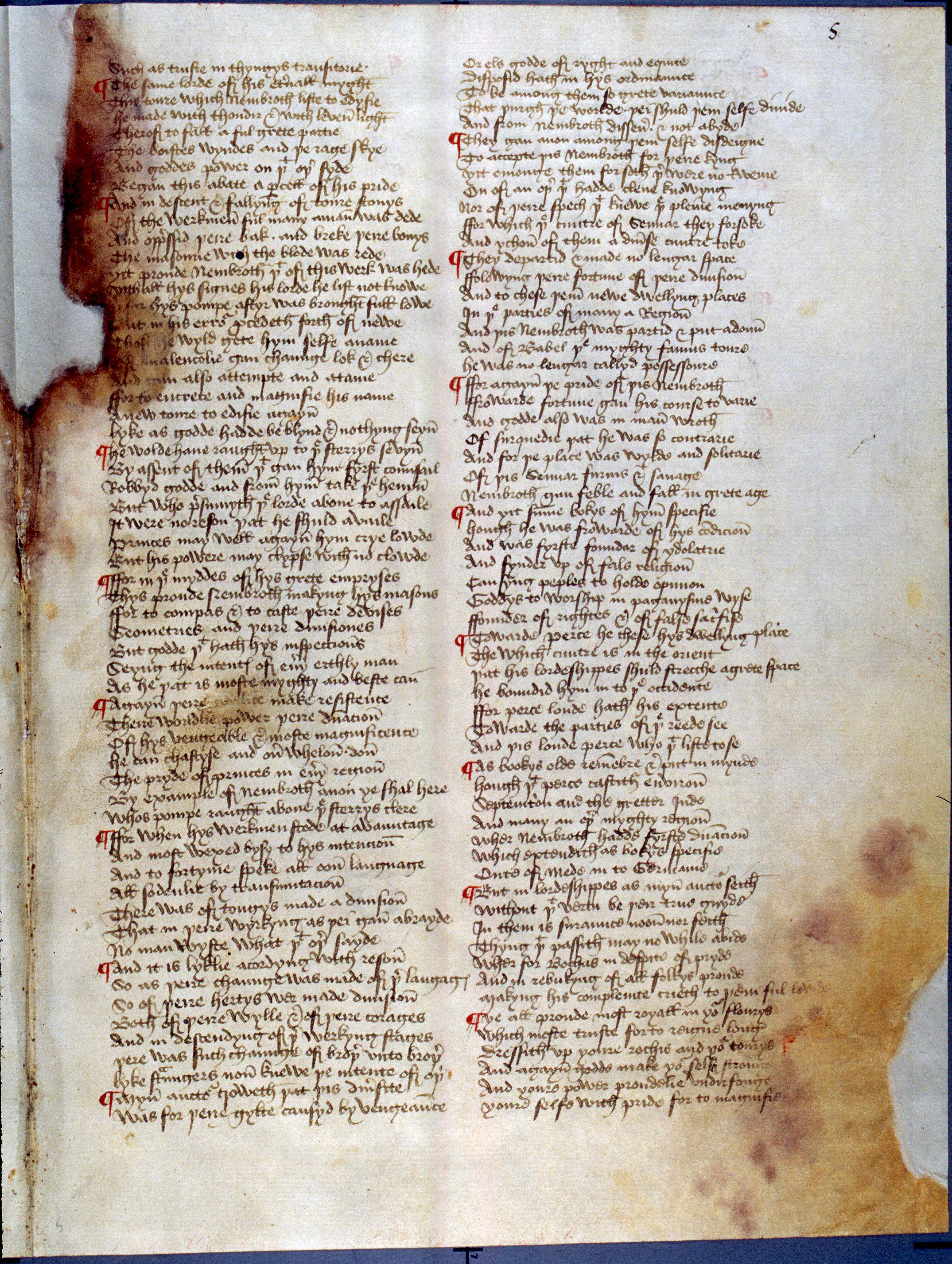 The Fall of Princes, produced around 1480, is a work by John Lydgate (ca.1370-1451) on the fortunes of famous people and how fate brought about their downfall. Lydgate based his text on a similar work by Boccaccio.
