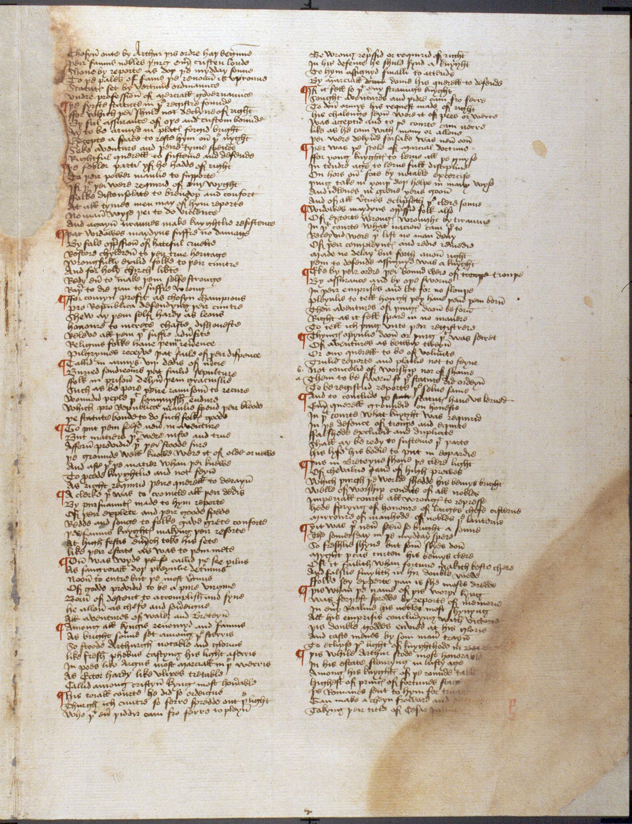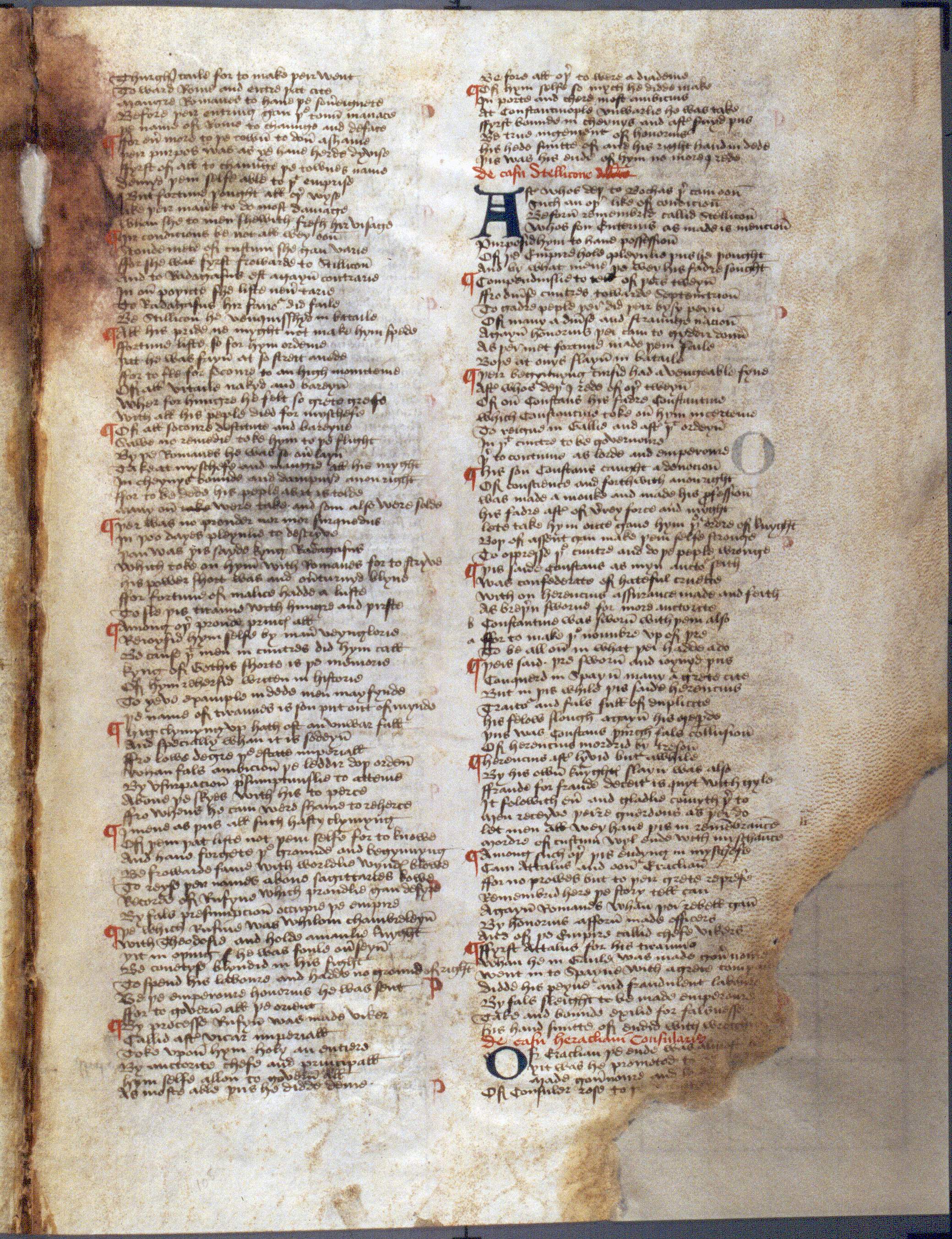 The Fall of Princes, produced around 1480, is a work by John Lydgate (ca.1370-1451) on the fortunes of famous people and how fate brought about their downfall. Lydgate based his text on a similar work by Boccaccio.