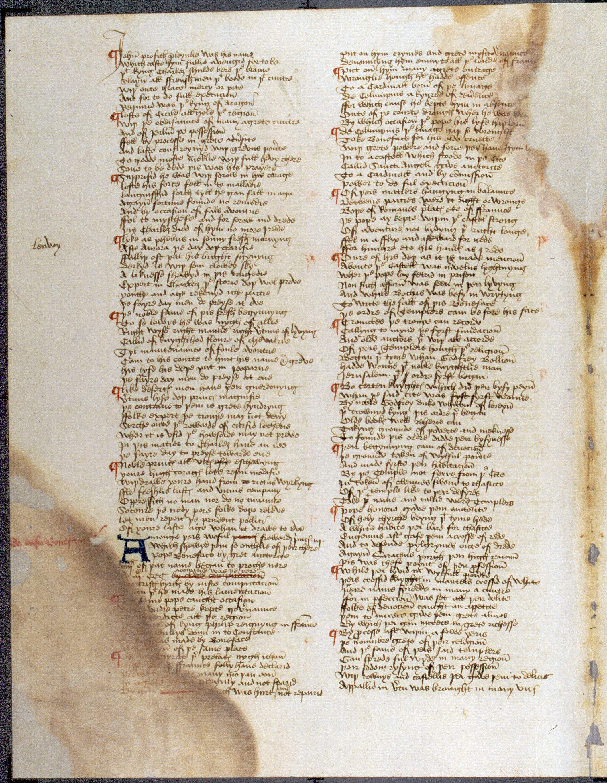 The Fall of Princes, produced around 1480, is a work by John Lydgate (ca.1370-1451) on the fortunes of famous people and how fate brought about their downfall. Lydgate based his text on a similar work by Boccaccio.