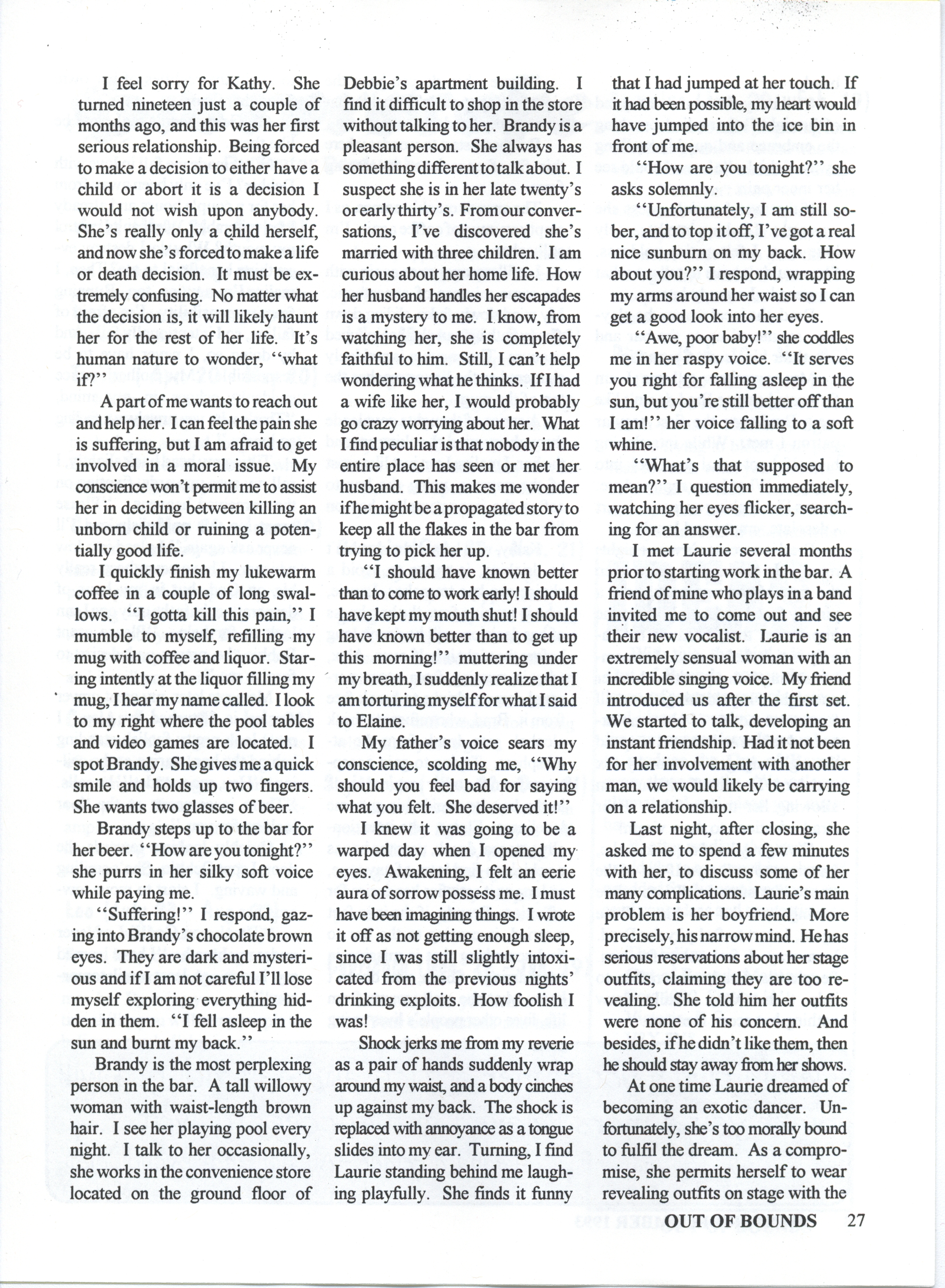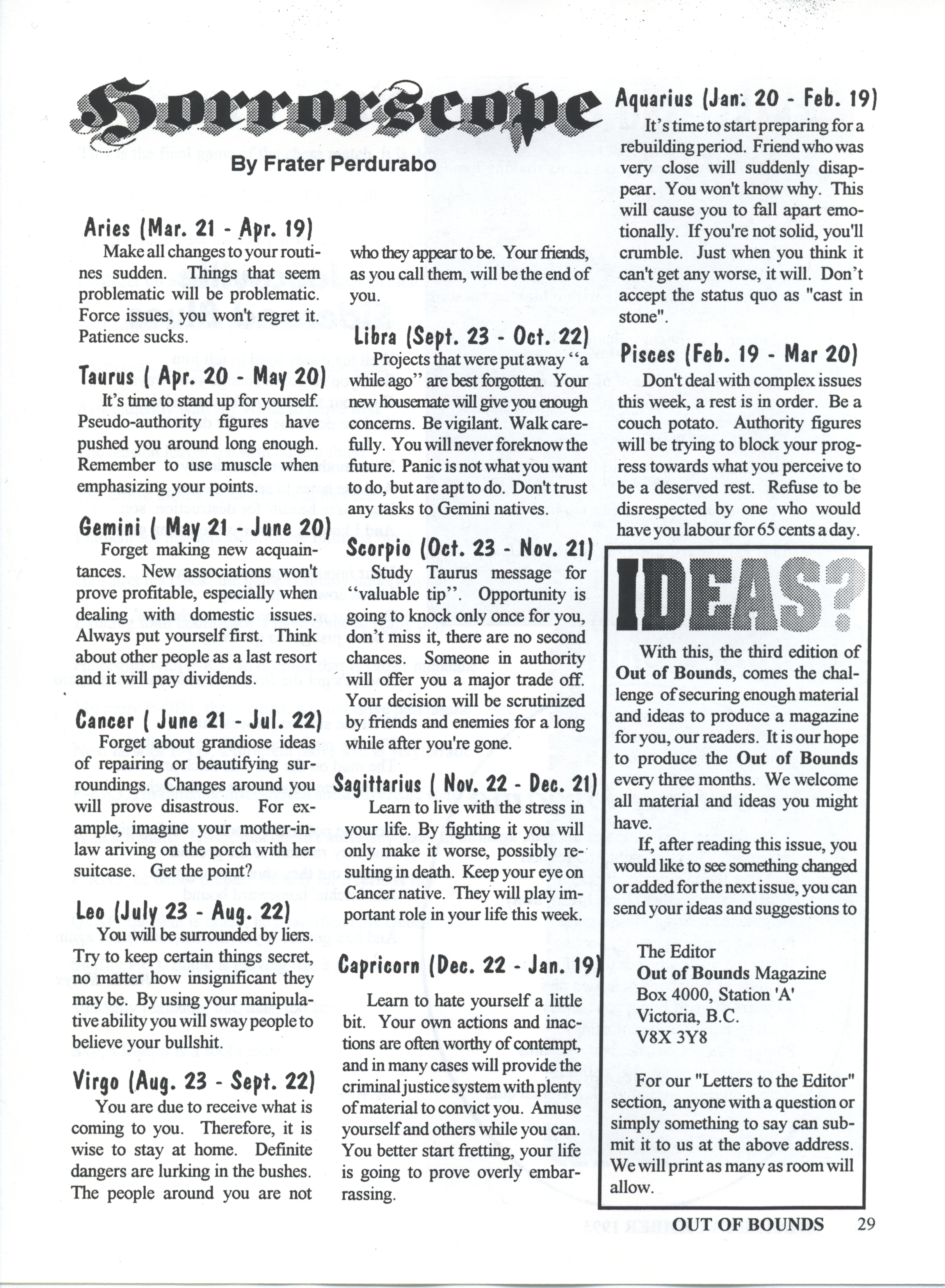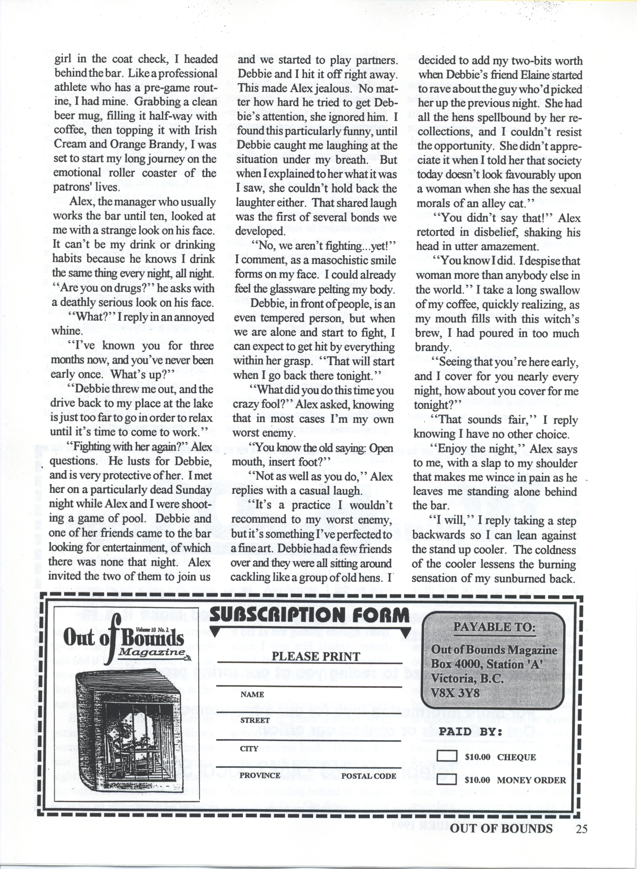 Article topics include: Simon Fraser University programme ended (editorial), Bill C-36 (Corrections and Conditional Release Act (revokes the "Penitentiary Services Regulations")), Legislative Proposals on High Risk Violent Offenders and the proposed Detention After Sentence Expiry (Bill C-36, chapter 20), Recovering drug addicts and alcoholics in and out of prison, Censorship and Out of bounds.