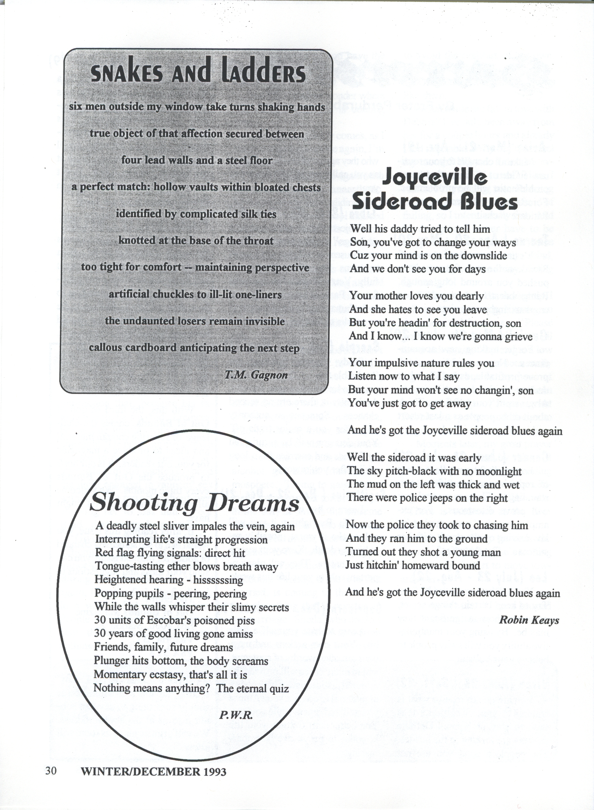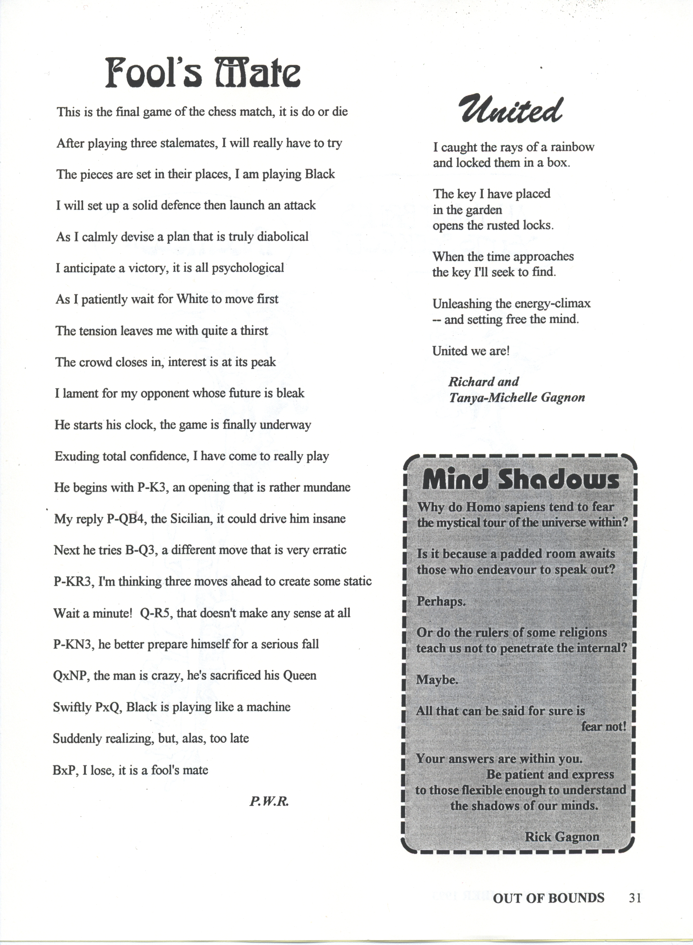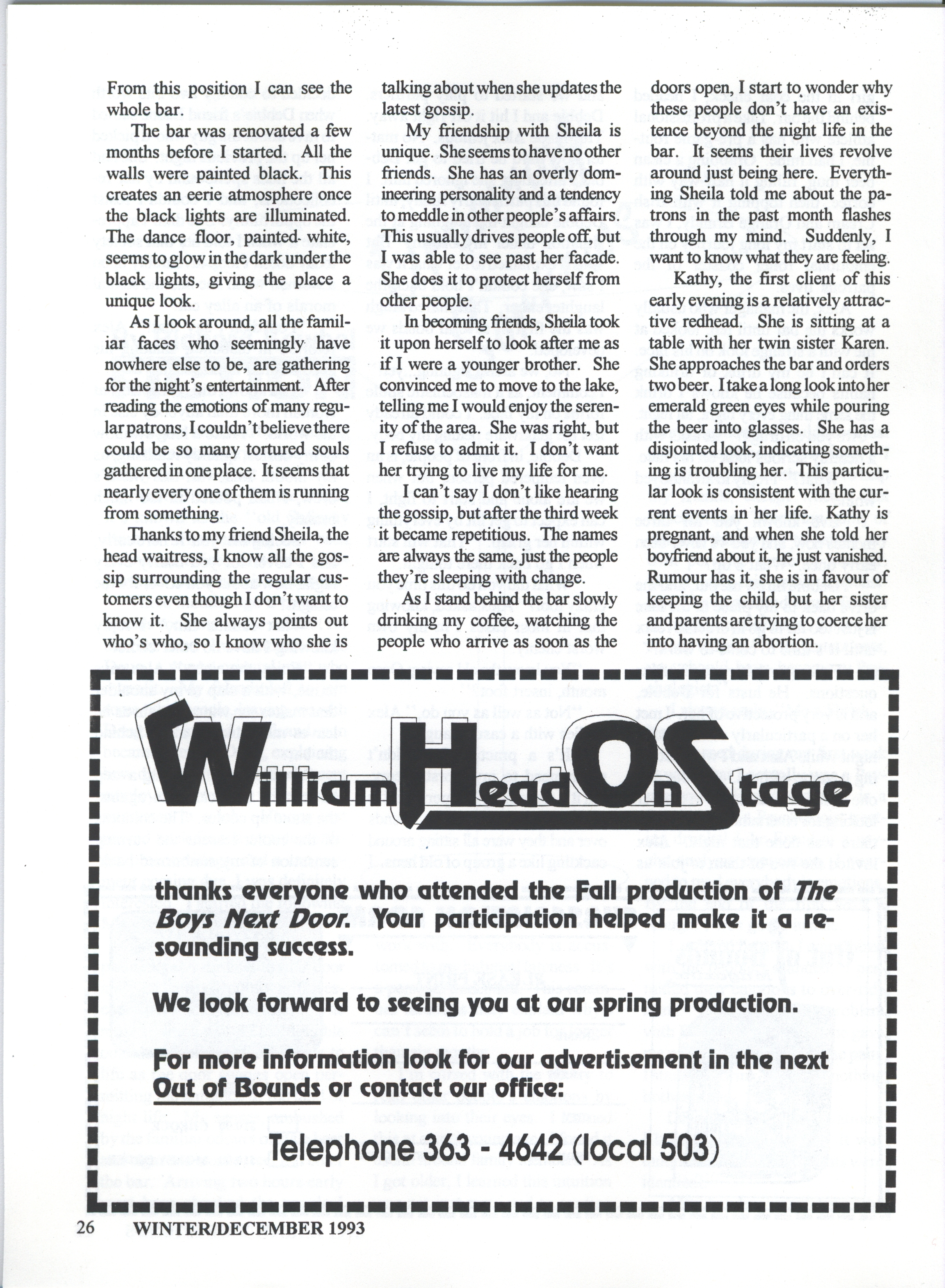 A non-profit quarterly publication of the thoughts, feelings, and distinct perspectives of prisoners and visitors by the prisoners at William Head Institution in Victoria, B.C. with the aim of providing a different view to the general public. Edited by Patrick W. Rafferty.