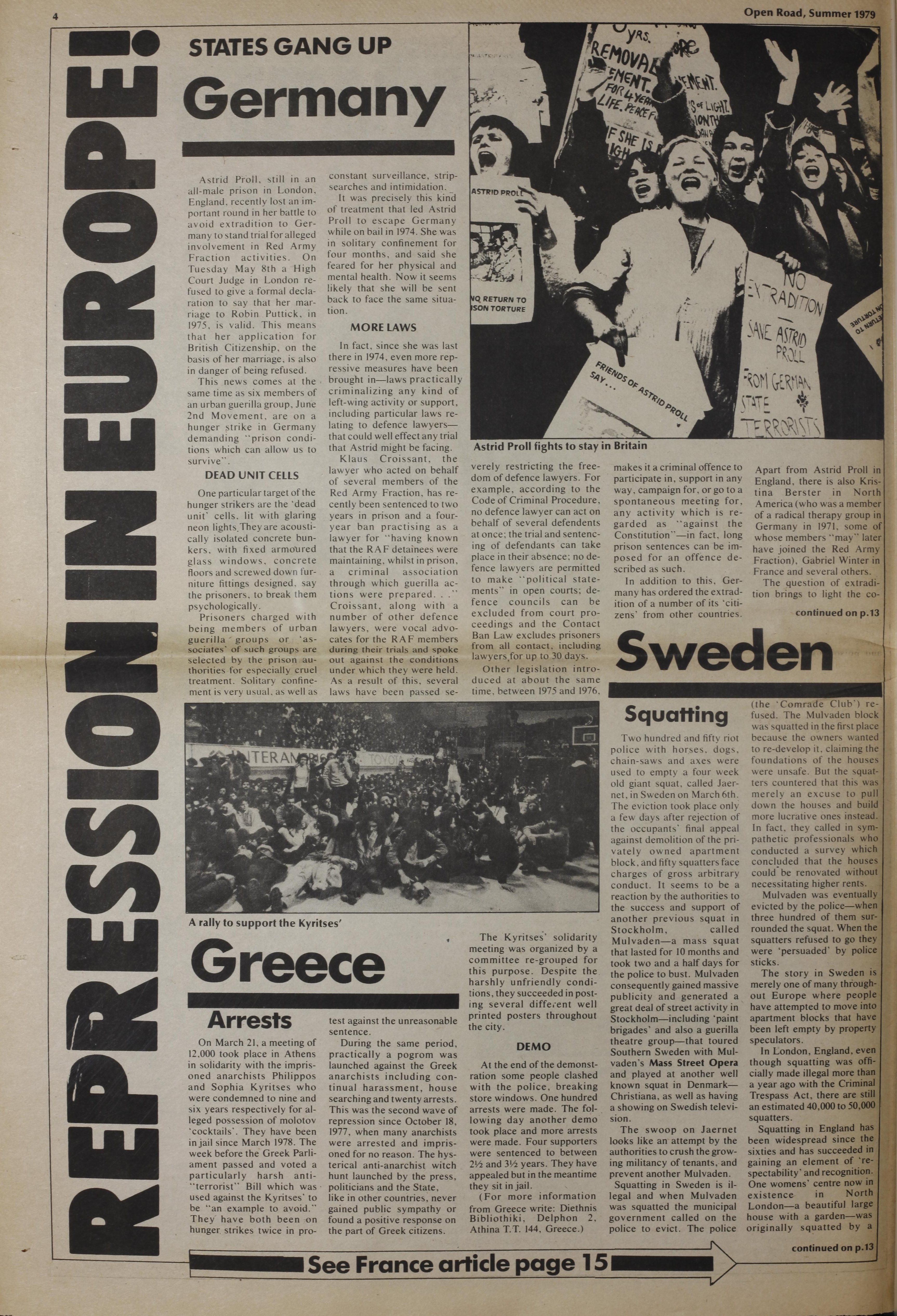 An anarchist publication produced in Vancouver, British Columbia focused on the international spectrum of anarchist and anti-authoritarian activities around popular struggles and social problems./In this issue: "Anti-nuke demos escalate: the heat after Harrisburg"; "Silkwood: industry pays" by Joy Scott; Roadside Notes; "Pornography: feminists break the bonds"; "Repression in Europe: Germany - states gang up; Sweden - Squatting; Greece - arrests; France - unions lose control by Marie Lloyd"; "Women's occupational hazaards: dying for work" by Tess Derbyfield; "Women workers of the Asian Rim" [poem] by Rebecca Cantwell; The Blast. "Lines from solitary; One step forward; Phil Ruff; Yvonne Wanrow free; State slaps SORWUC; Woman hating ritual; Revolting women in Iran; Bordering on anarchy; Links without chains"; "Anarcha-feminism moving together" by Elaine Leeder; "Abortion and sterilization. "Keep your laws off my body""; "New ways of doing it: unions that work"; News from nowhere; Kids stuff; "War waged on rage"; "Privacy promotes problems: the lonely crowd" by Georgia Sanger; "Coming out correctly"; "Oppression beyond spirit" by Emma Lazarus