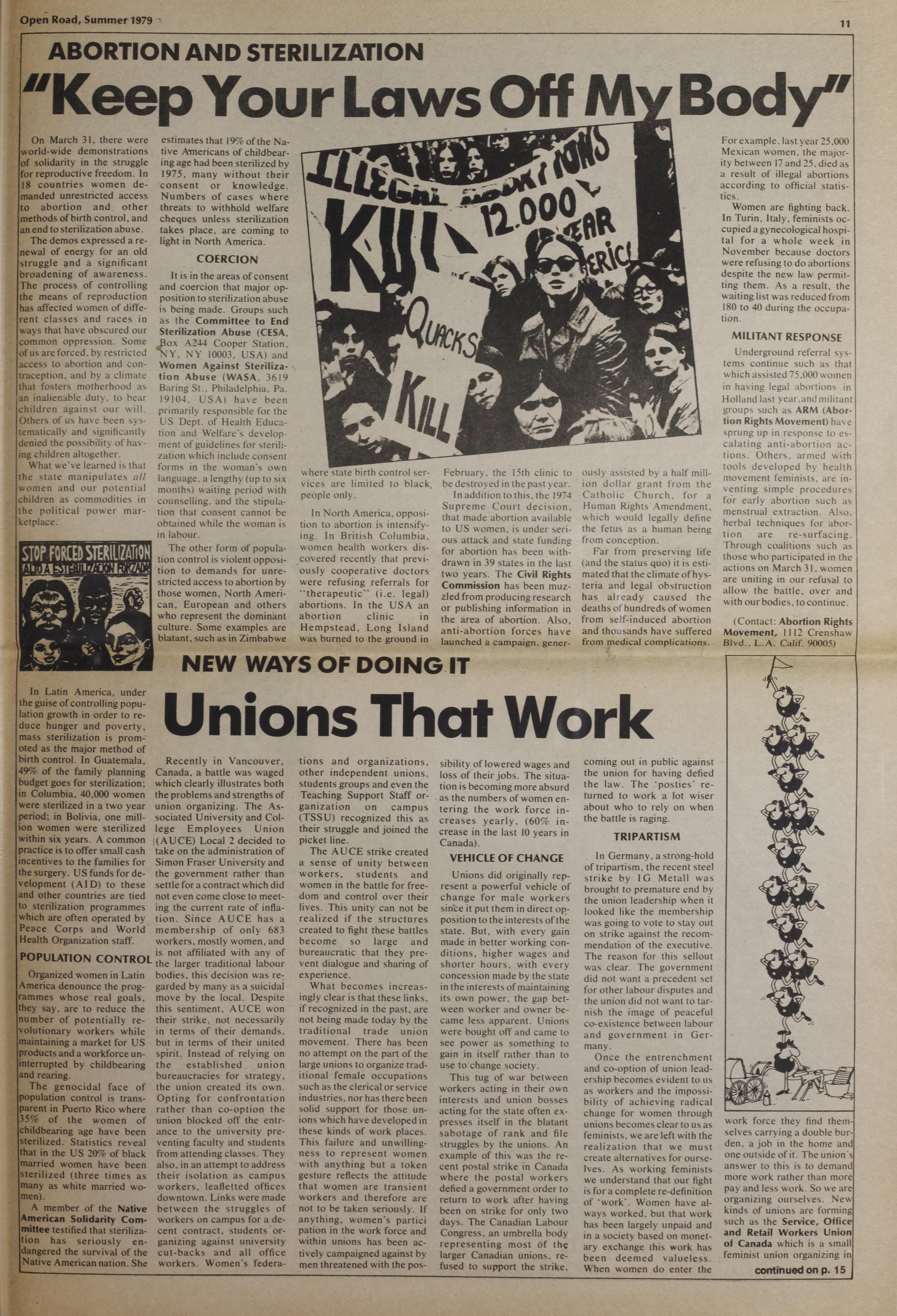 An anarchist publication produced in Vancouver, British Columbia focused on the international spectrum of anarchist and anti-authoritarian activities around popular struggles and social problems./In this issue: "Anti-nuke demos escalate: the heat after Harrisburg"; "Silkwood: industry pays" by Joy Scott; Roadside Notes; "Pornography: feminists break the bonds"; "Repression in Europe: Germany - states gang up; Sweden - Squatting; Greece - arrests; France - unions lose control by Marie Lloyd"; "Women's occupational hazaards: dying for work" by Tess Derbyfield; "Women workers of the Asian Rim" [poem] by Rebecca Cantwell; The Blast. "Lines from solitary; One step forward; Phil Ruff; Yvonne Wanrow free; State slaps SORWUC; Woman hating ritual; Revolting women in Iran; Bordering on anarchy; Links without chains"; "Anarcha-feminism moving together" by Elaine Leeder; "Abortion and sterilization. "Keep your laws off my body""; "New ways of doing it: unions that work"; News from nowhere; Kids stuff; "War waged on rage"; "Privacy promotes problems: the lonely crowd" by Georgia Sanger; "Coming out correctly"; "Oppression beyond spirit" by Emma Lazarus