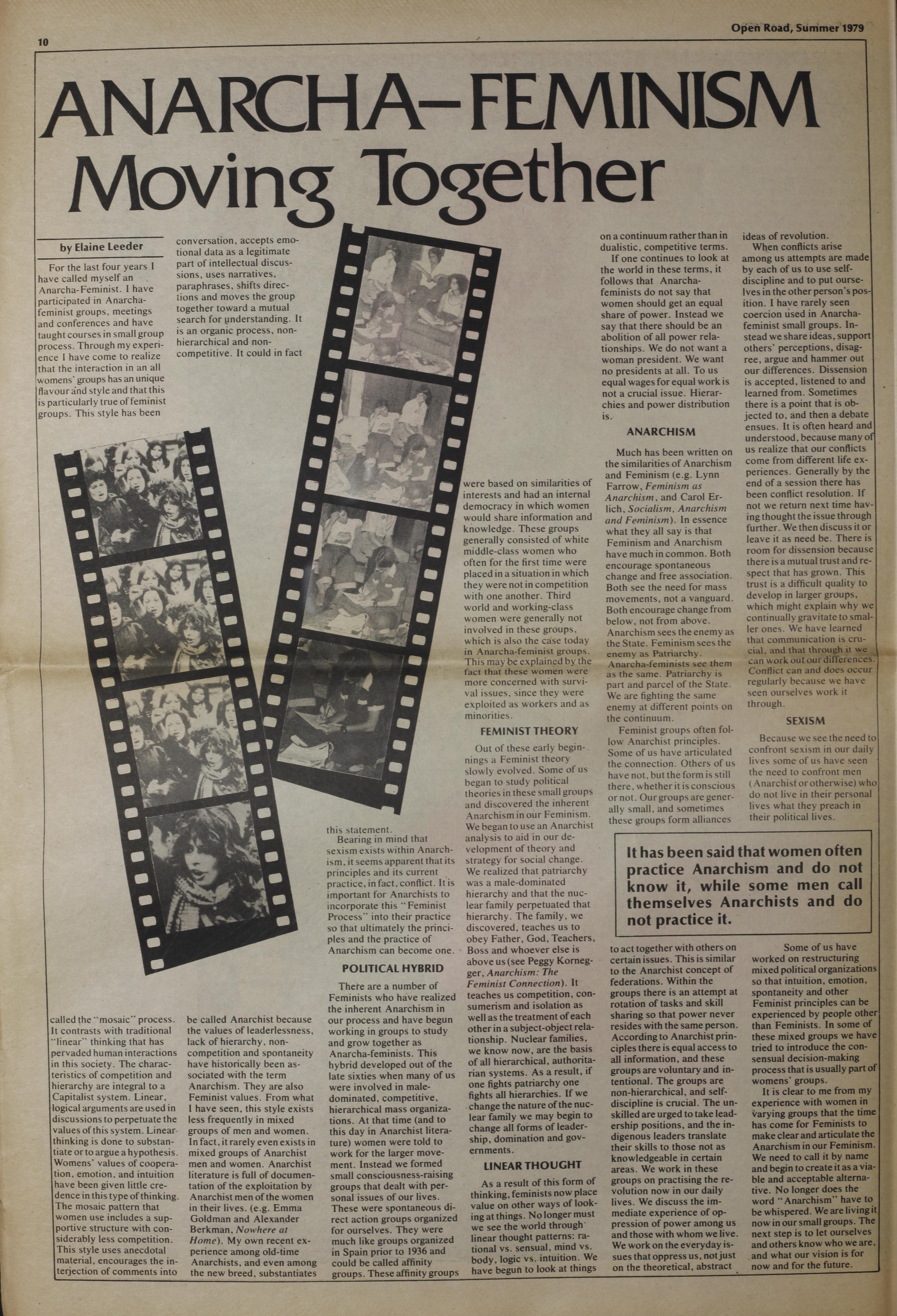 An anarchist publication produced in Vancouver, British Columbia focused on the international spectrum of anarchist and anti-authoritarian activities around popular struggles and social problems./In this issue: "Anti-nuke demos escalate: the heat after Harrisburg"; "Silkwood: industry pays" by Joy Scott; Roadside Notes; "Pornography: feminists break the bonds"; "Repression in Europe: Germany - states gang up; Sweden - Squatting; Greece - arrests; France - unions lose control by Marie Lloyd"; "Women's occupational hazaards: dying for work" by Tess Derbyfield; "Women workers of the Asian Rim" [poem] by Rebecca Cantwell; The Blast. "Lines from solitary; One step forward; Phil Ruff; Yvonne Wanrow free; State slaps SORWUC; Woman hating ritual; Revolting women in Iran; Bordering on anarchy; Links without chains"; "Anarcha-feminism moving together" by Elaine Leeder; "Abortion and sterilization. "Keep your laws off my body""; "New ways of doing it: unions that work"; News from nowhere; Kids stuff; "War waged on rage"; "Privacy promotes problems: the lonely crowd" by Georgia Sanger; "Coming out correctly"; "Oppression beyond spirit" by Emma Lazarus