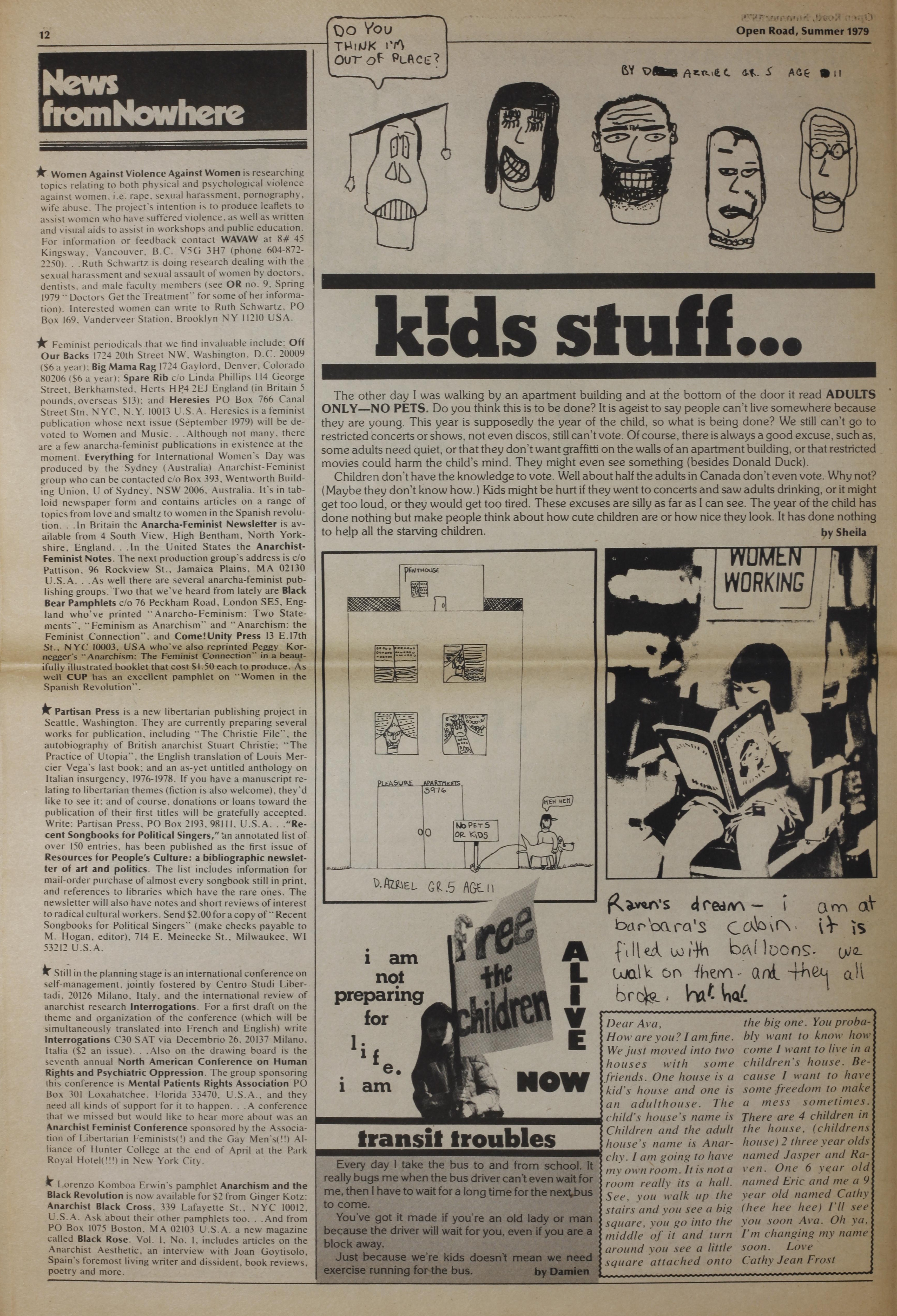 An anarchist publication produced in Vancouver, British Columbia focused on the international spectrum of anarchist and anti-authoritarian activities around popular struggles and social problems./In this issue: "Anti-nuke demos escalate: the heat after Harrisburg"; "Silkwood: industry pays" by Joy Scott; Roadside Notes; "Pornography: feminists break the bonds"; "Repression in Europe: Germany - states gang up; Sweden - Squatting; Greece - arrests; France - unions lose control by Marie Lloyd"; "Women's occupational hazaards: dying for work" by Tess Derbyfield; "Women workers of the Asian Rim" [poem] by Rebecca Cantwell; The Blast. "Lines from solitary; One step forward; Phil Ruff; Yvonne Wanrow free; State slaps SORWUC; Woman hating ritual; Revolting women in Iran; Bordering on anarchy; Links without chains"; "Anarcha-feminism moving together" by Elaine Leeder; "Abortion and sterilization. "Keep your laws off my body""; "New ways of doing it: unions that work"; News from nowhere; Kids stuff; "War waged on rage"; "Privacy promotes problems: the lonely crowd" by Georgia Sanger; "Coming out correctly"; "Oppression beyond spirit" by Emma Lazarus
