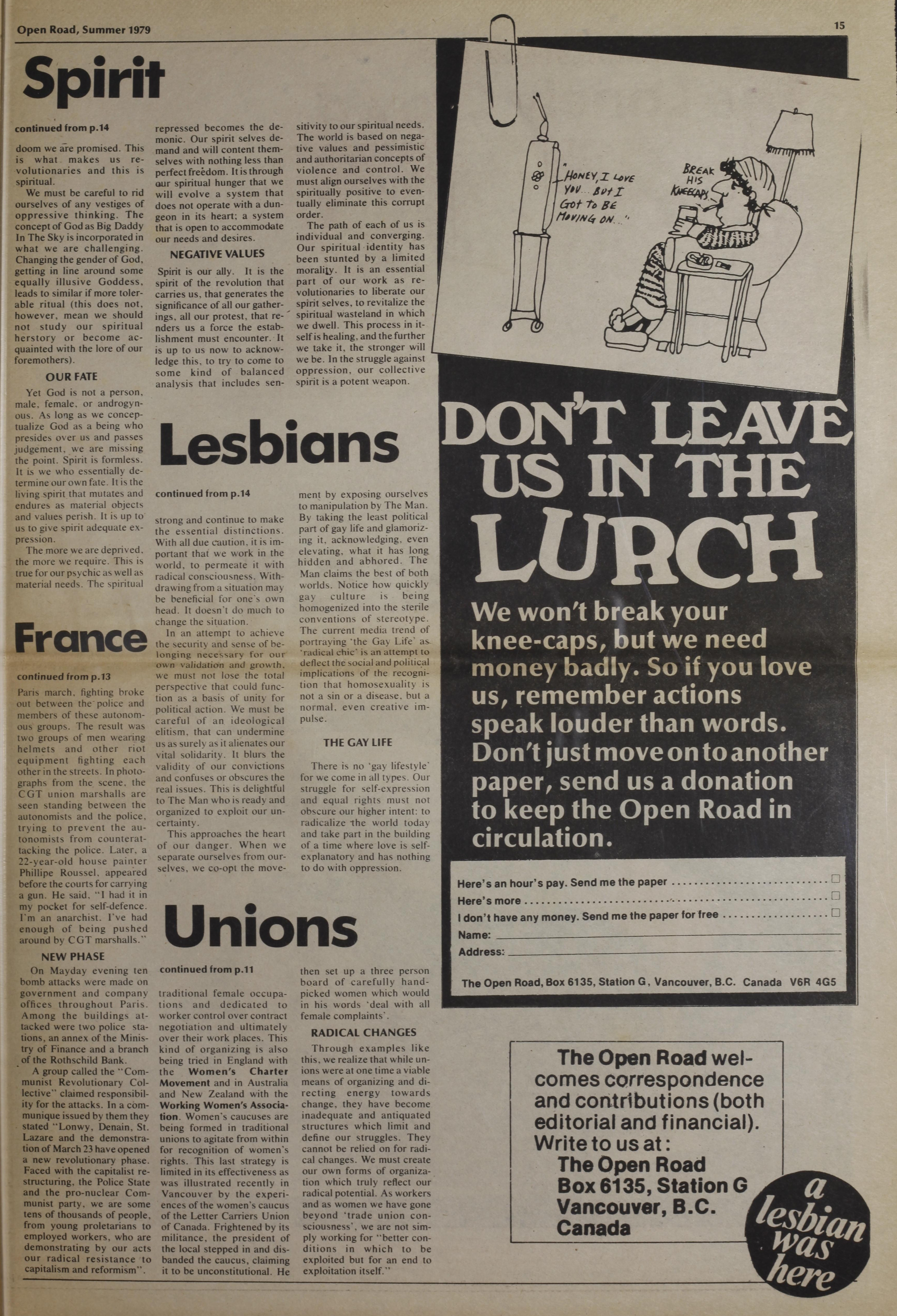 An anarchist publication produced in Vancouver, British Columbia focused on the international spectrum of anarchist and anti-authoritarian activities around popular struggles and social problems./In this issue: "Anti-nuke demos escalate: the heat after Harrisburg"; "Silkwood: industry pays" by Joy Scott; Roadside Notes; "Pornography: feminists break the bonds"; "Repression in Europe: Germany - states gang up; Sweden - Squatting; Greece - arrests; France - unions lose control by Marie Lloyd"; "Women's occupational hazaards: dying for work" by Tess Derbyfield; "Women workers of the Asian Rim" [poem] by Rebecca Cantwell; The Blast. "Lines from solitary; One step forward; Phil Ruff; Yvonne Wanrow free; State slaps SORWUC; Woman hating ritual; Revolting women in Iran; Bordering on anarchy; Links without chains"; "Anarcha-feminism moving together" by Elaine Leeder; "Abortion and sterilization. "Keep your laws off my body""; "New ways of doing it: unions that work"; News from nowhere; Kids stuff; "War waged on rage"; "Privacy promotes problems: the lonely crowd" by Georgia Sanger; "Coming out correctly"; "Oppression beyond spirit" by Emma Lazarus