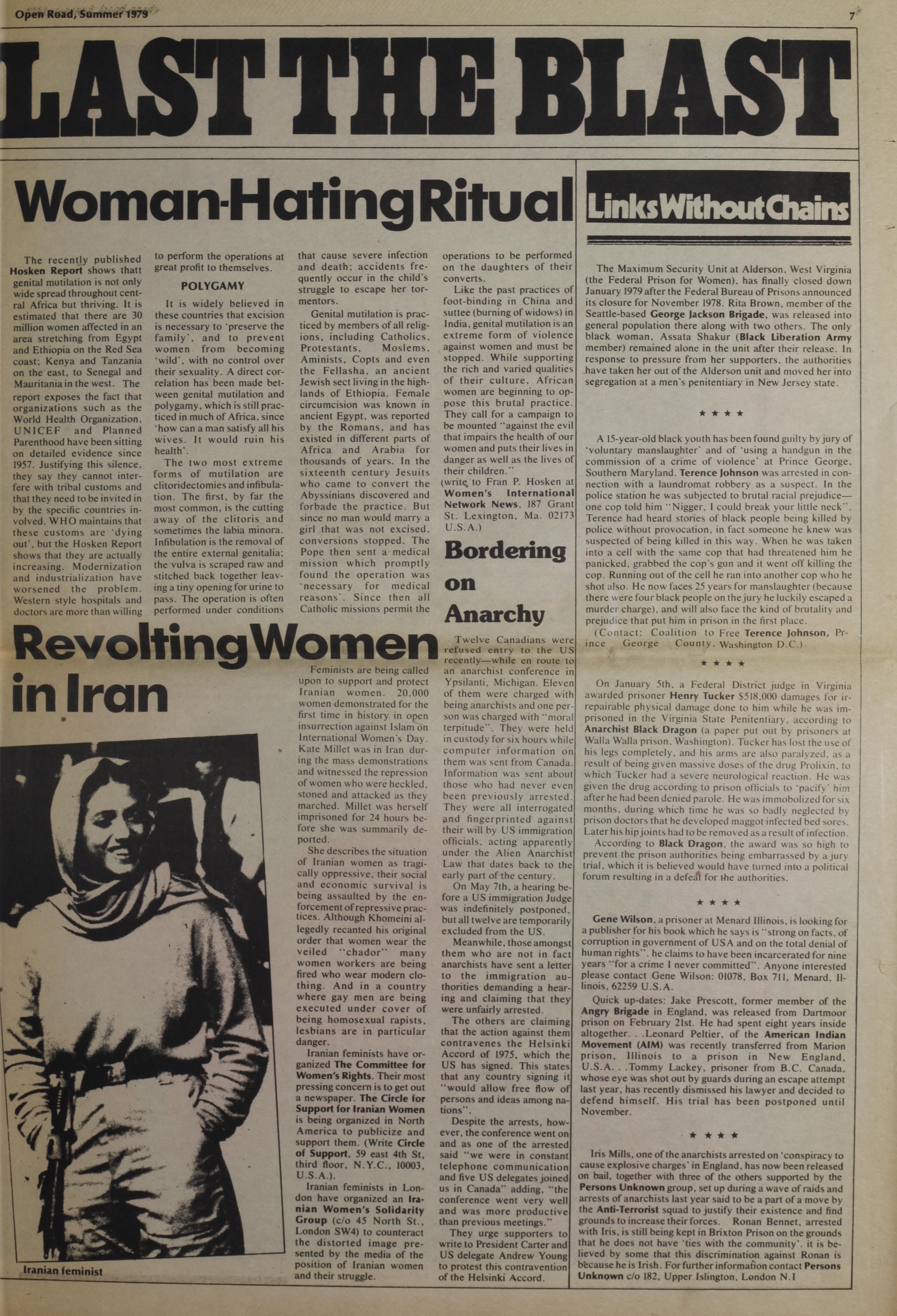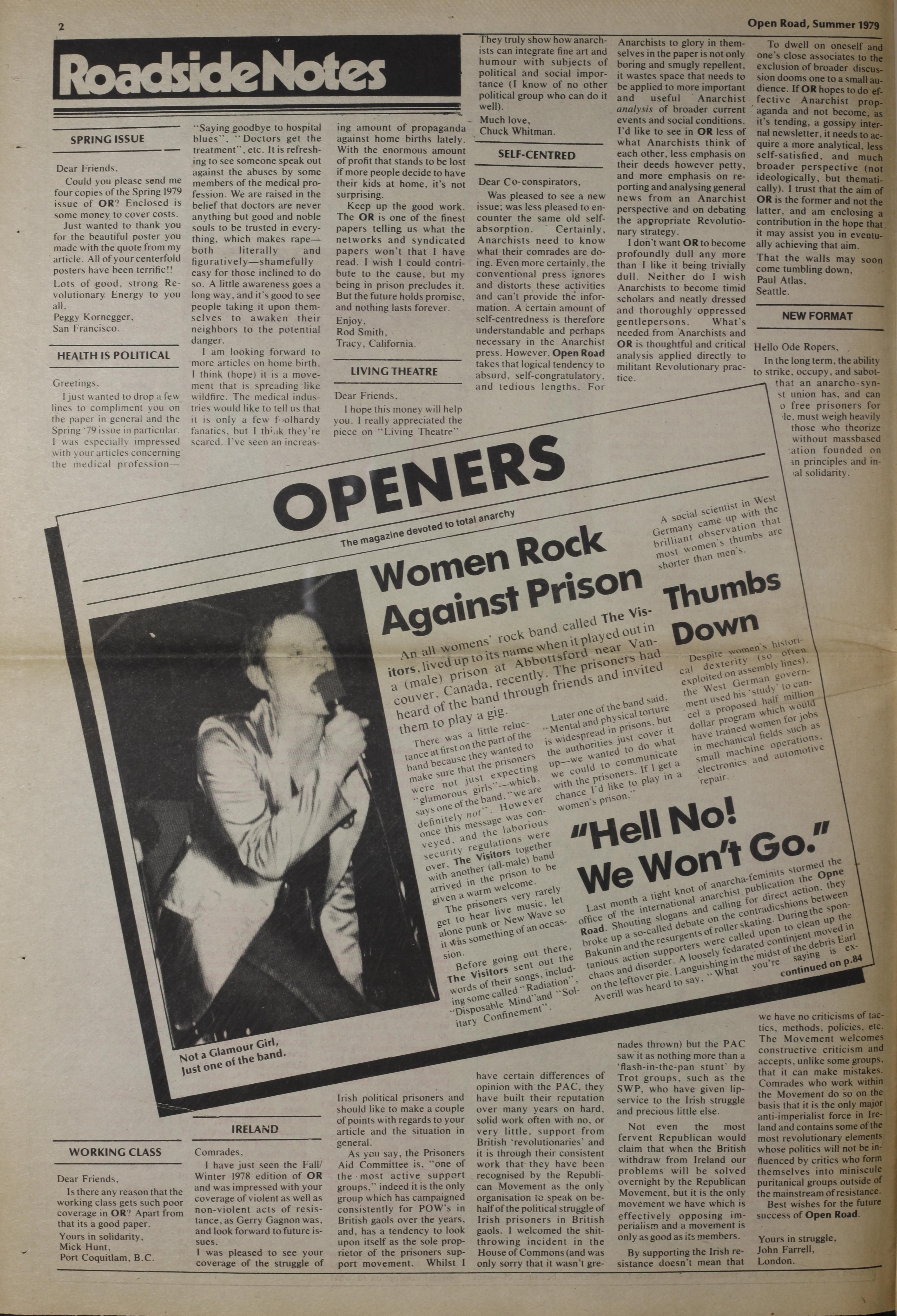 An anarchist publication produced in Vancouver, British Columbia focused on the international spectrum of anarchist and anti-authoritarian activities around popular struggles and social problems./In this issue: "Anti-nuke demos escalate: the heat after Harrisburg"; "Silkwood: industry pays" by Joy Scott; Roadside Notes; "Pornography: feminists break the bonds"; "Repression in Europe: Germany - states gang up; Sweden - Squatting; Greece - arrests; France - unions lose control by Marie Lloyd"; "Women's occupational hazaards: dying for work" by Tess Derbyfield; "Women workers of the Asian Rim" [poem] by Rebecca Cantwell; The Blast. "Lines from solitary; One step forward; Phil Ruff; Yvonne Wanrow free; State slaps SORWUC; Woman hating ritual; Revolting women in Iran; Bordering on anarchy; Links without chains"; "Anarcha-feminism moving together" by Elaine Leeder; "Abortion and sterilization. "Keep your laws off my body""; "New ways of doing it: unions that work"; News from nowhere; Kids stuff; "War waged on rage"; "Privacy promotes problems: the lonely crowd" by Georgia Sanger; "Coming out correctly"; "Oppression beyond spirit" by Emma Lazarus