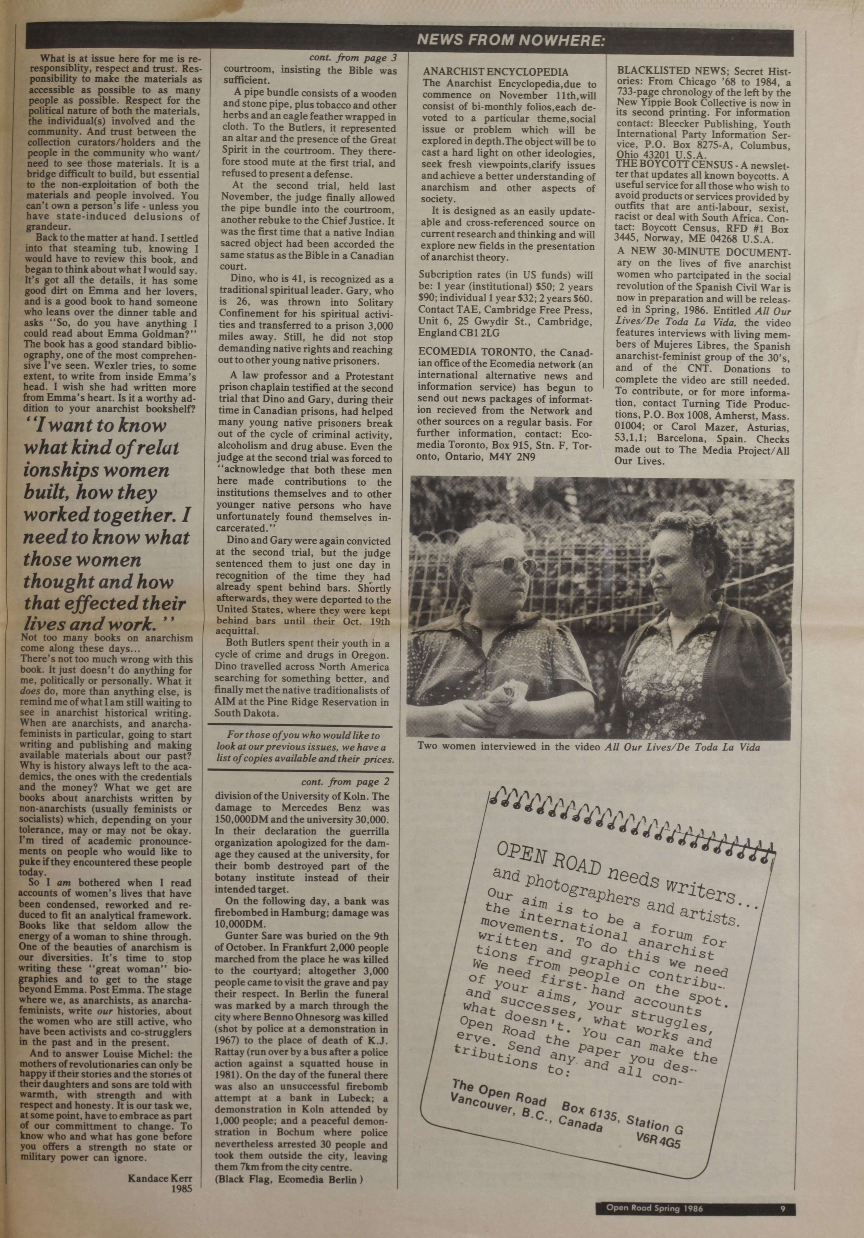In this issue: Anarchist News. "Protestors block waste trucks"; Immigrants, fascists clash"; "Riots commemorate uprising"; Zimbabwe workers' occupation"; "Demonstrator's death sparks riot"; "Cops murder squatter"; "Narita struggle continues"; "Fake CNT formed"; "Fake 'Soli' issued"; "Australian Women's Army formed". American Natives. "Butlers acquitted!"; "Resistance at Wollaston". Resistance no. 10 [8 p. : ill.]. "British youth strike back"; "Julie rats out"; News briefs; "Fighting communist cells"; "Revolutionary cells & Rote Zora"; "Computer companies attacked"; "RZ explain bombing series"; "Anti-Apartheid bombings: Action Direct". [end of Resistance no. 10]. "Emma Goldman: an intimate life" [by Alice Wexler; review] by Kandace Kerr; News from nowhere; Roadside notes.