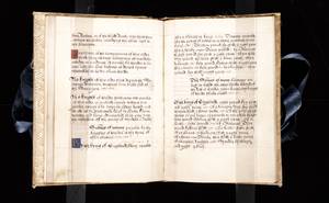 - 26 lines to a page, ruled in red, written in dark brown ink in a calligraphic secretary hand with some flourishes, forty-seven illuminated initials (one 4-line, three 3-line, the rest 2-line) in gold, red and blue with white tracery, illuminated frontispiece with the arms of the order surrounded by the garter and surmounted by the crown. In a modern binding embroidered with the Arms of the Order. Fol. 2v bears coat of arms of the Order of the Garter under Edward VI, blue and red with silver and gold illumination (silver has tarnished somewhat).