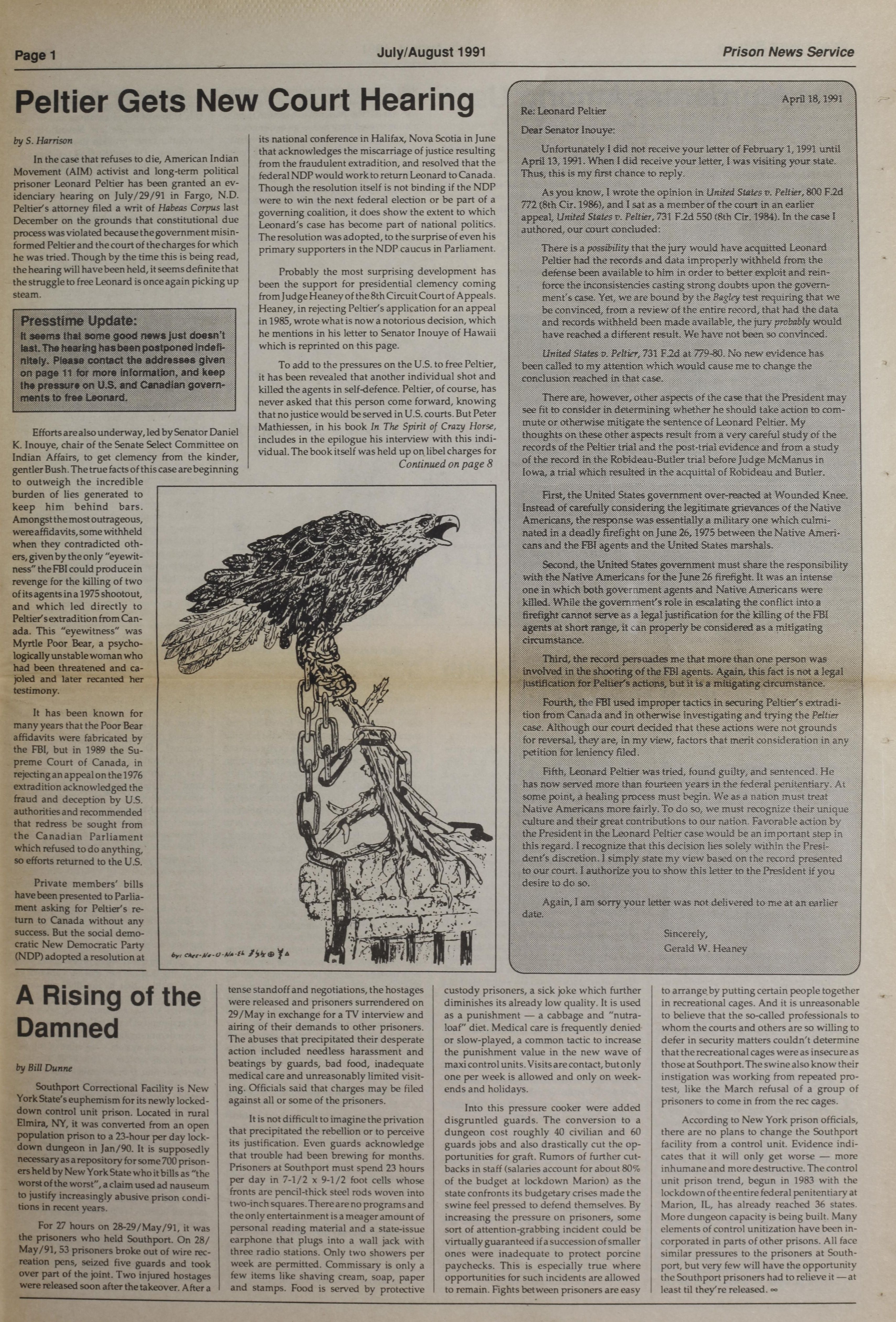PNS editor: Bulldozer Collective. Article topics include: "Peltier gets new court hearing", by S. Harrison -- Open letter to Senator Inouye from Gerald W. Heaney -- Needless harassment and beatings from guards, bad food, inadequate medical care, and limited visiting sparked prisoners at Southport Correctional Facility in New State to take over a part of the facility in protest ("A rising of the damned", by Bill Dunne) -- U.S. Supreme Court takes hard line on appeals of death sentence ("The murderers among use", by Bill Dunne) -- Television program investigates health services in federal prisons ("60 Minutes lances BOP health services: stuff comes out"), by Tim Blunk) --A brief history of MOVE, a black liberation group founded by John Africa. In 1985, the group made national news when police dropped a bomb on the Osage Avenue house from a helicopter in an attempt to end an armed standoff. The explosion ignited a fire in which 11 people died, including five children and the group's leader, John Africa. Only two occupants survived, Ramona Africa, an adult and Birdie, a child. In addition, 60 homes were destroyed ("May 13th remembered", by Mumia abu-Jamal) -- "A prison within a prison: the Special Handling Unit at Saskatchewan Penitentiary", by Richard Martel) -- An introductory talk welcoming outsiders to a Native Brotherhood social at the federal prison in Renous, New Brunswick ("Sacred circle social") -- Afrikan National Ujama (ANU), a Pan Afrikan Nationalist group has been educating and organizing black prisoners in New Jersey ("New Jersey prisoners under attack", by Jim Campbell) -- "Some policies can not wait!: AIDS in Canadian prisons", by Zoltan Lugosi -- Sentencing Project (Washington, D.C.) reports an enormous increase in imprisonment rates in the United States, especially affecting black men ("The crime of black imprisonment", by Steve Whitman and "Cons in prose: good and bad", by Bill Dunne) -- Interview of Linda Evans of the Resistance Conspiracy Six ("AIDS education and lesbian pride in Pleasanton", interviewed by Sunday Harrison) -- "Letter: Michael Stotts responds to criticism" (Stotts responds to Larry Giddings article in the May/June 1991 issue of PNS). (Note: p. 6-7 is a double-page spread.) Marionette, No. 55, May-June, 1991. Editor: Bill Dunne. Article topics include: Errors in Washington reporter Michael Isikoff's newspaper article about USP Marion ("Washington putz") -- Report on new USP Marion warden C. Allen Turner and his actions at Springfield facility ("Prison warden may be hazardous to prisoners", by Tim Blunk) -- Incident report leads to unwarranted punishment (Trivia that hurts") -- "Stop the legal lynching of Mumia abu-Jamal!: free Mumia abu-Jamal, abolish the death penalty, free all political prisoners and POWs!"