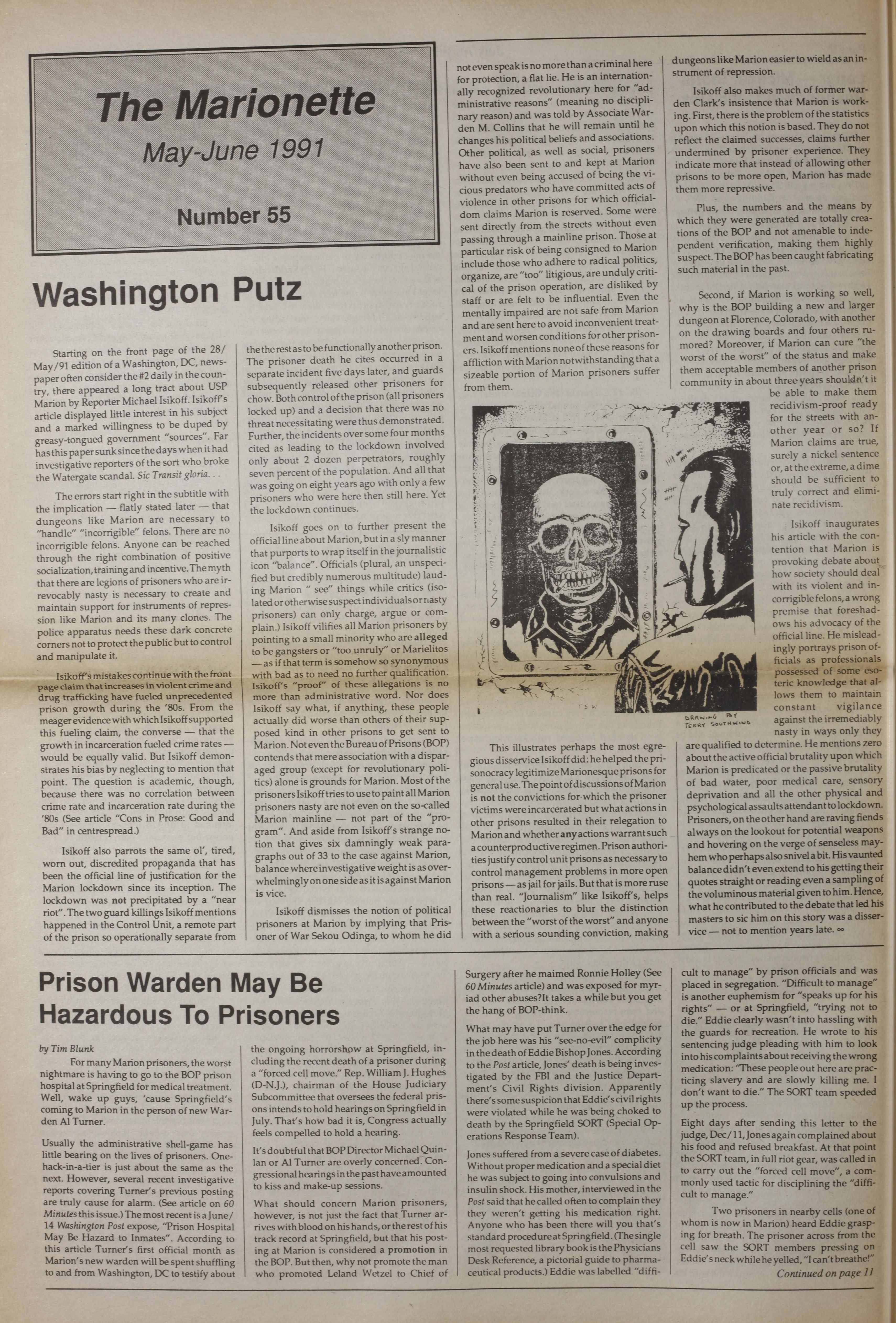 PNS editor: Bulldozer Collective. Article topics include: "Peltier gets new court hearing", by S. Harrison -- Open letter to Senator Inouye from Gerald W. Heaney -- Needless harassment and beatings from guards, bad food, inadequate medical care, and limited visiting sparked prisoners at Southport Correctional Facility in New State to take over a part of the facility in protest ("A rising of the damned", by Bill Dunne) -- U.S. Supreme Court takes hard line on appeals of death sentence ("The murderers among use", by Bill Dunne) -- Television program investigates health services in federal prisons ("60 Minutes lances BOP health services: stuff comes out"), by Tim Blunk) --A brief history of MOVE, a black liberation group founded by John Africa. In 1985, the group made national news when police dropped a bomb on the Osage Avenue house from a helicopter in an attempt to end an armed standoff. The explosion ignited a fire in which 11 people died, including five children and the group's leader, John Africa. Only two occupants survived, Ramona Africa, an adult and Birdie, a child. In addition, 60 homes were destroyed ("May 13th remembered", by Mumia abu-Jamal) -- "A prison within a prison: the Special Handling Unit at Saskatchewan Penitentiary", by Richard Martel) -- An introductory talk welcoming outsiders to a Native Brotherhood social at the federal prison in Renous, New Brunswick ("Sacred circle social") -- Afrikan National Ujama (ANU), a Pan Afrikan Nationalist group has been educating and organizing black prisoners in New Jersey ("New Jersey prisoners under attack", by Jim Campbell) -- "Some policies can not wait!: AIDS in Canadian prisons", by Zoltan Lugosi -- Sentencing Project (Washington, D.C.) reports an enormous increase in imprisonment rates in the United States, especially affecting black men ("The crime of black imprisonment", by Steve Whitman and "Cons in prose: good and bad", by Bill Dunne) -- Interview of Linda Evans of the Resistance Conspiracy Six ("AIDS education and lesbian pride in Pleasanton", interviewed by Sunday Harrison) -- "Letter: Michael Stotts responds to criticism" (Stotts responds to Larry Giddings article in the May/June 1991 issue of PNS). (Note: p. 6-7 is a double-page spread.) Marionette, No. 55, May-June, 1991. Editor: Bill Dunne. Article topics include: Errors in Washington reporter Michael Isikoff's newspaper article about USP Marion ("Washington putz") -- Report on new USP Marion warden C. Allen Turner and his actions at Springfield facility ("Prison warden may be hazardous to prisoners", by Tim Blunk) -- Incident report leads to unwarranted punishment (Trivia that hurts") -- "Stop the legal lynching of Mumia abu-Jamal!: free Mumia abu-Jamal, abolish the death penalty, free all political prisoners and POWs!"