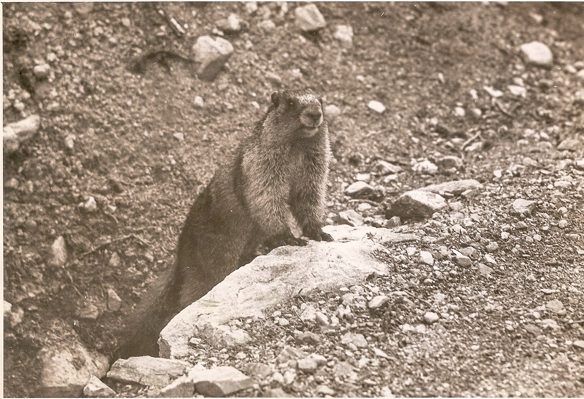 A darker Selkirk whistler peers from its burrow entrance. Hoary marmot is the largest North American ground squirrel and is often nicknamed "the whistler" for its high-pitched warning issued to alert other members of the colony to possible danger. The animals are sometimes called "whistle pigs". (Family: sciuridae; binomial name: marmota caligata)
