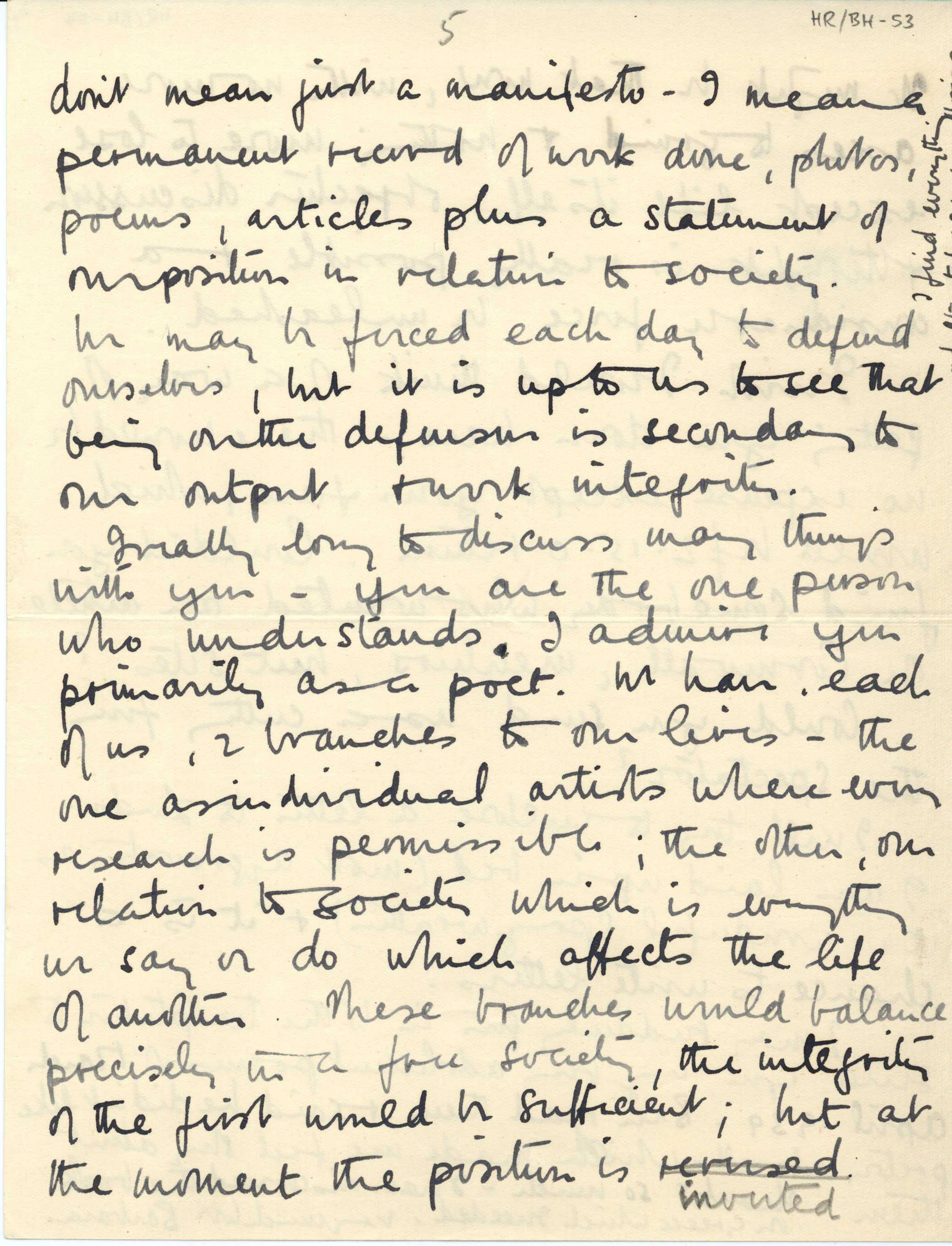 Part of a collection of letters to Sir Herbert Read from Dame Barbara Hepworth (English artist and sculptor and, along with Read, a member of the modern art movement Unit One founded by Paul Nash), that span the time period of 1940 to 1965 and discuss their artistic and literary endeavors, philosophical and political views, and personal lives. Discusses economic conditions. Letter is dated February 7.