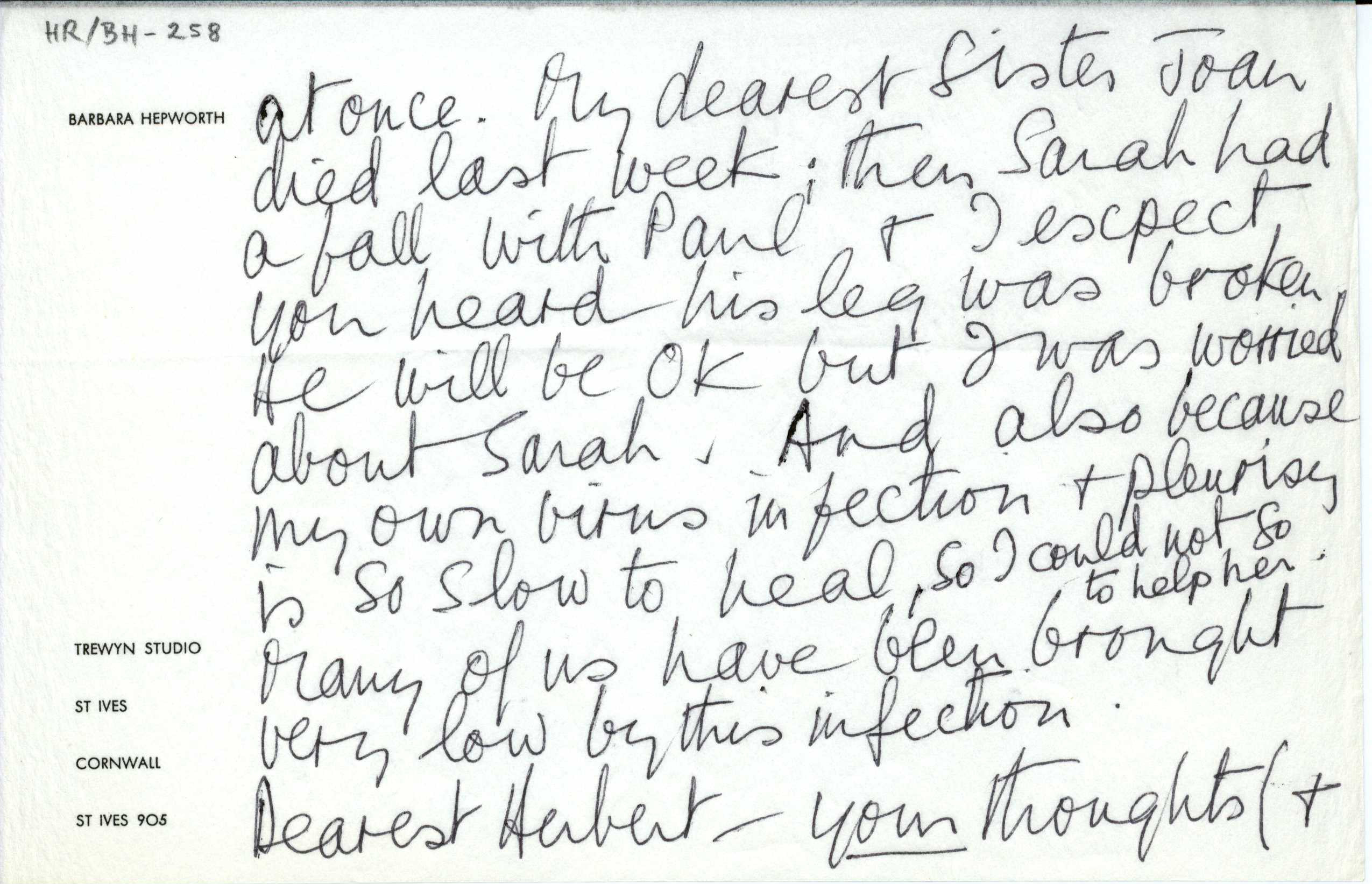 Part of a collection of letters to Sir Herbert Read from Dame Barbara Hepworth (English artist and sculptor and, along with Read, a member of the modern art movement Unit One founded by Paul Nash), that span the time period of 1940 to 1965 and discuss their artistic and literary endeavors, philosophical and political views, and personal lives. Hepworth thanks Read for telling her about the German project. Her sister Joan died the previous week.
