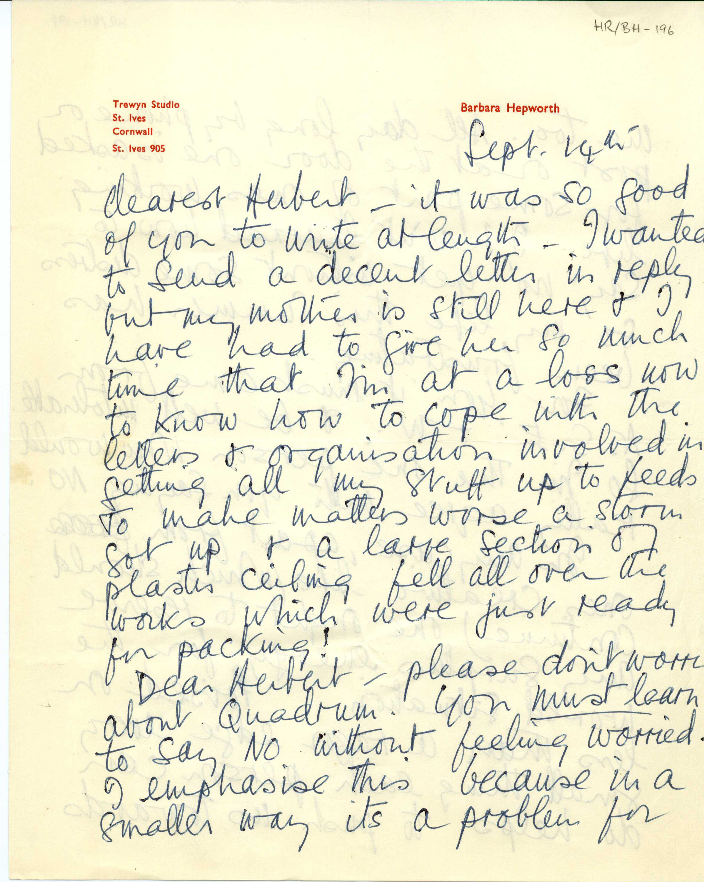 Letter from Barbara Hepworth to Herbert Read, September 14, [1958?]