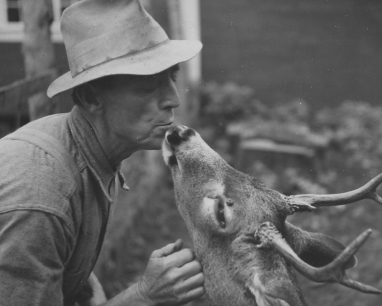 A man kissing the mouth of a male deer with a wart above its eye from a fighting injury.
